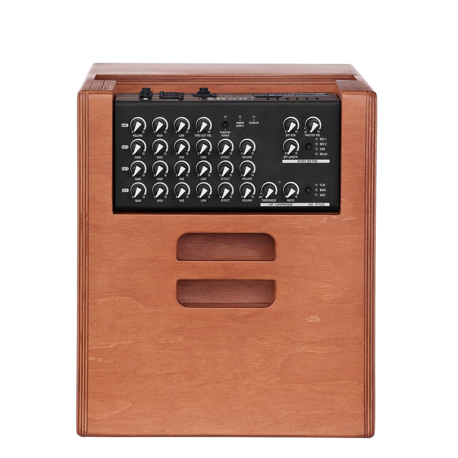 Z mocą wyjściową 250 W RMS, ACUS ONEFORSTRINGS 10FERDI WOOD jest przystosowany do nagłaśniania nawet dużych przestrzeni, oferując głęboki, wyraźny dźwięk bez zniekształceń. Każde z trzech głównych wejść zostało wyposażone we wzmocnienie, 3-pasmowy korektor, regulację głośności i możliwość dodania efektów, co pozwala na precyzyjne dopasowanie ustawień dźwięku do specyfiki każdego instrumentu.