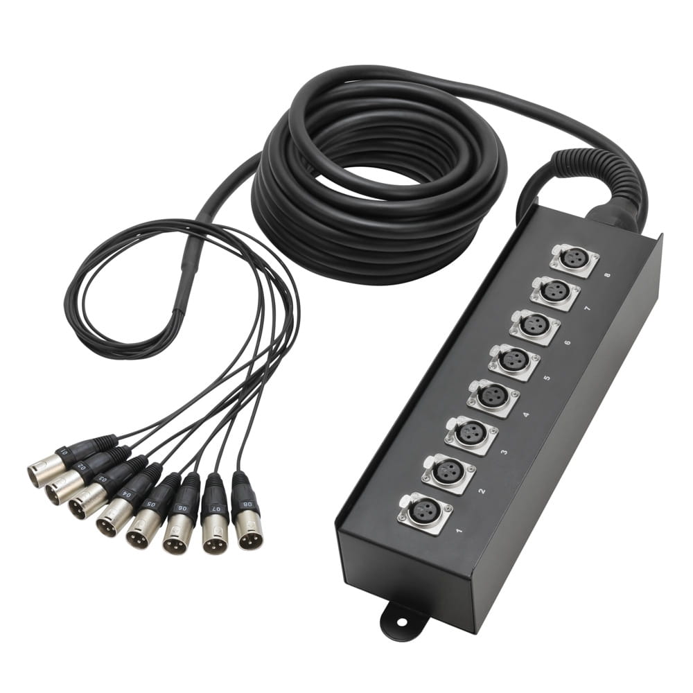 Ośmiokanałowy rdzeń z przymocowanym na stałe kablem o długości 10 m zakończonym ośmioma wtyczkami XLR produkcji firmy Adam Hall. Wykonany z metalu moduł sceniczny wyposażony został w boczny otwór montażowy oraz solidny element zaciskowy odciążający n aprężenie kabla, który chroni podatny na uszkodzenia odcinek między modułem a kablem. Dodatkowe wzmocnienia w miejscu połączenia kabli z wtyczkami zapobiegają zmęczeniu materiału i złamaniu przewodów.