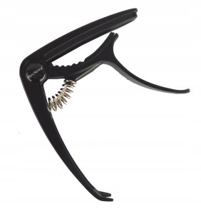 Czarny kapodaster do gitary akustycznej, metalowy.