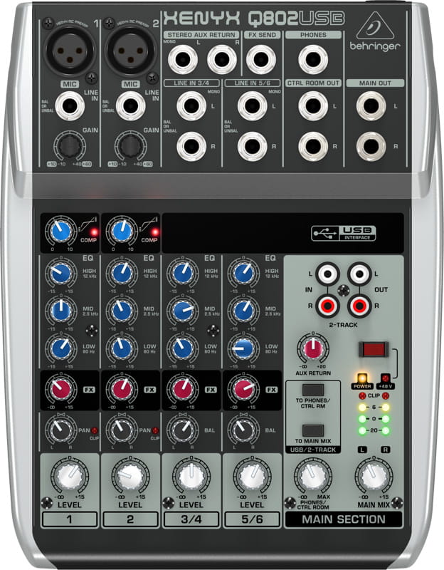 8-kanałowy mikser analogowy z 2 podgrupami, przedwzmacniaczami mikrofonowymi XENYX, kompresorami, klasyczną "brytyjską" korekcją i złączem USB.