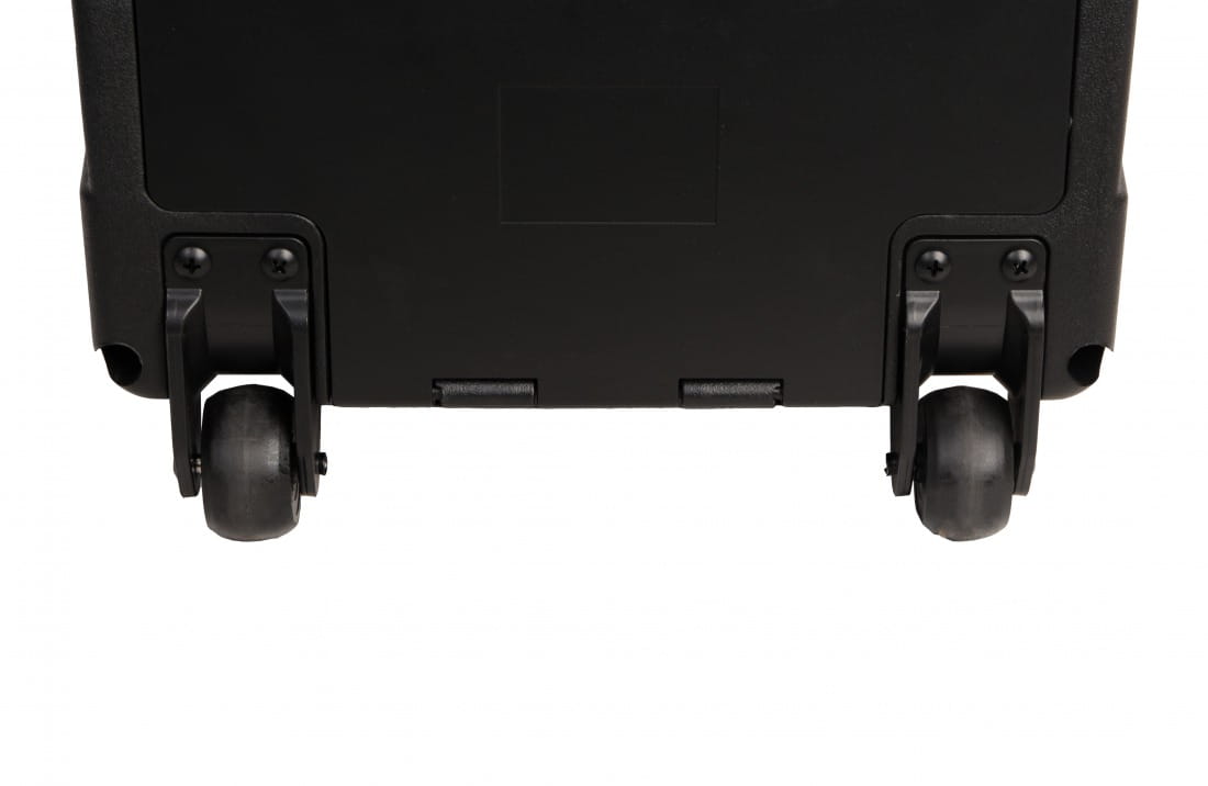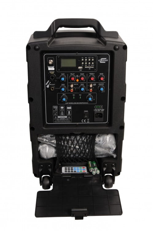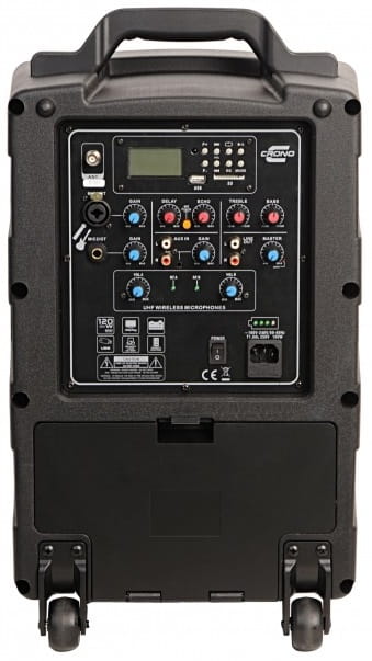Crono Wheeler 10 to mobilny system nagłośnieniowy z wbudowanym akumulatorem. Dwudrożna konstrukcja oferuje 120 Watt maksymalnej. Wbudowane złącze USB oraz BLUETOOTH oraz czytnik kart SD. Urządzenie przy maksymalnej głośności może pracować aż 10 godzin na jednym naładowaniu akumulatora. Dzięki temu Wheeler 10 to idealne rozwiązanie dla mobilnych solistów, instrumentalistów i wokalistów, którzy szukają przenośnych rozwiązań do występów w plenerze. Prezentowany model to także bardzo wydajny sprzęt konferencyjny lub do prowadzenie prezentacji i pokazów.