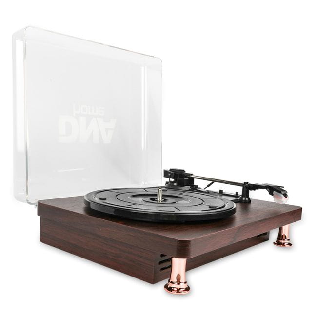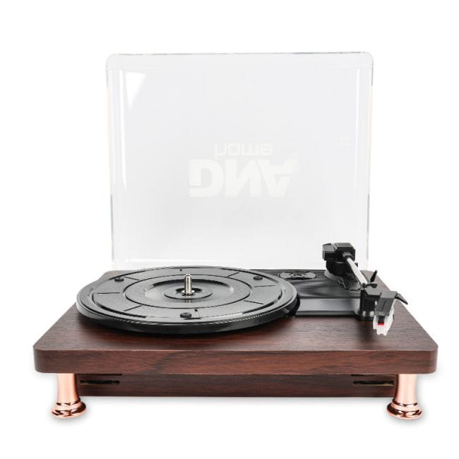 DNA TT1 to stylowy gramofon do odtwarzania płyt winylowych, wyposażony w wejście AUX, wyjście RCA, złącze słuchawkowe oraz obsługę Bluetooth. Dzięki eleganckiej, mahoniowej obudowie oraz przeźroczystej pokrywie, a także wysokiej jakości podzespołom elektronicznym, sprzęt doskonale reprodukuje mechanikę dźwięku płyt winylowych i świetnie prezentuje się w każdym pomieszczeniu. To elegancki gramofon nie tylko do domu, ale także kameralnego klubu, kawiarni albo stylowej restauracji.