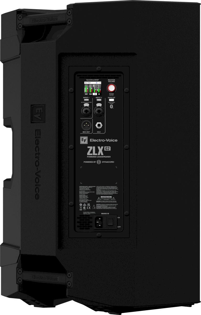 Aktywne modele ZLX G2 są zasilone elektroniką marki Dynacord – siostrzanego brandu Electro-Voice. Ultrawydajne wzmacniacze klasy D o mocy 1000 W są zintegrowane z czterokanałowym mikserem cyfrowym z wysokiej jakości procesorem efektów. Mikser wyposażono w dwa gniazda combo XLR/TRS (w tym jedno z zasilaniem Phantom) oraz wejście Hi-Z, które pozwala na podłączenie instrumentu bezpośrednio, bez konieczności użycia Di-box-a. Na pokładzie znajdują się również profesjonalne narzędzia, takie jak rozbudowane EQ, automatyczne tłumienie sprzężeń, ducking, kompresja oraz presety brzmieniowe dla instrumentów i mikrofonów. Procesor DSP zawiera niespotykaną w tej klasie cenowej funkcję linii opóźniającej do zastosowań eventowych i konferencyjnych. Dostępnych jest pięć presetów brzmieniowych: Music, Live, Speech, Club i FRFR (Full Range, Flat Response). Nowością w ZLX G2 i unikatową cechą w tej klasie produktów jest ustawienie FRFR, które oferuje neutralną charakterystykę częstotliwościową dla użycia z procesorem modelującym i symulatorem kolumny gitarowej. Głośniki aktywne ZLX G2 zawierają również presety podziału pasma dla subwooferów serii ELX200 i EKX. Ponadto filtry górnoprzepustowe dostępne w procesorze DSP pozwalają na kompatybilność z innymi subwooferami. Dodatkowo istnieje możliwość blokady ustawień, dzięki czemu jest pewność, że impreza odbędzie się bez niespodzianek.