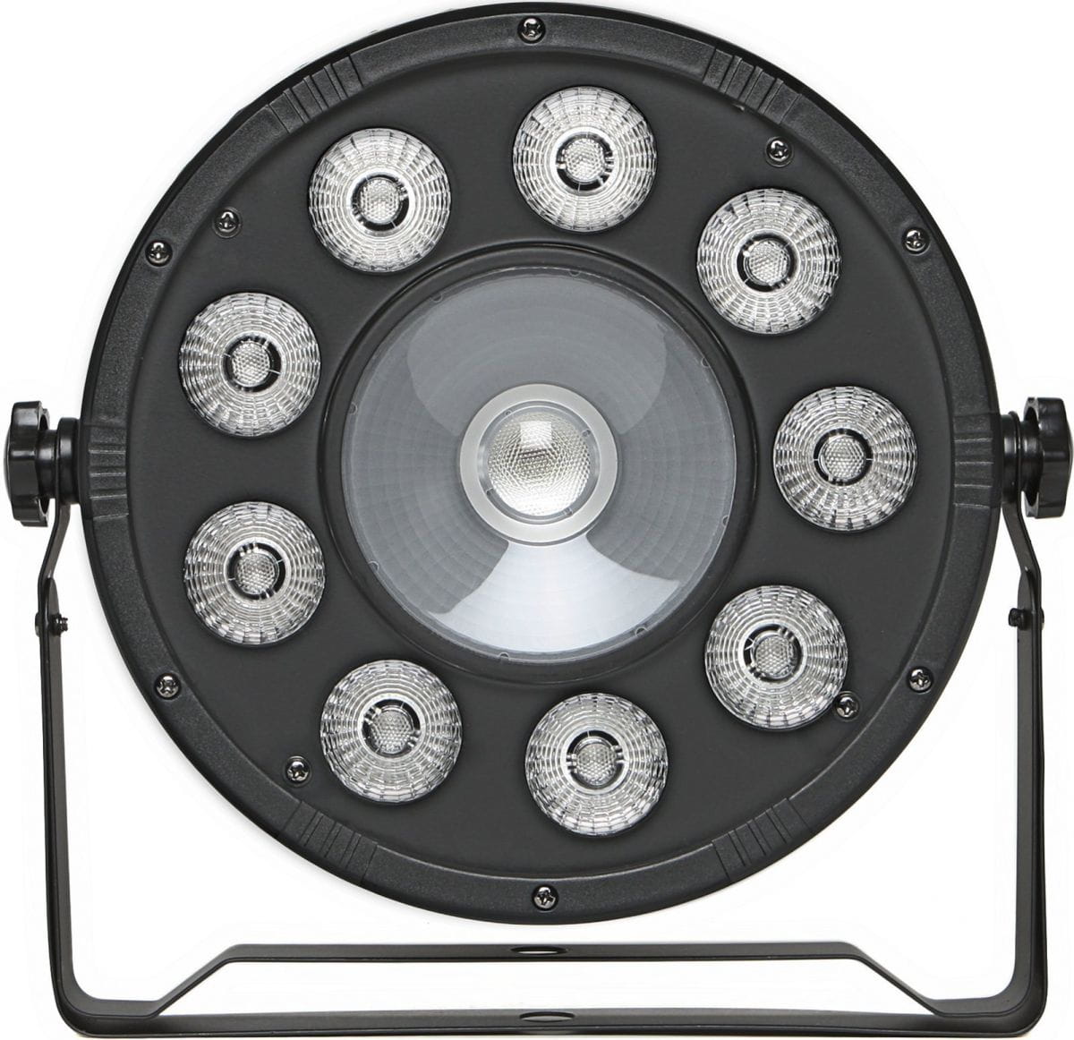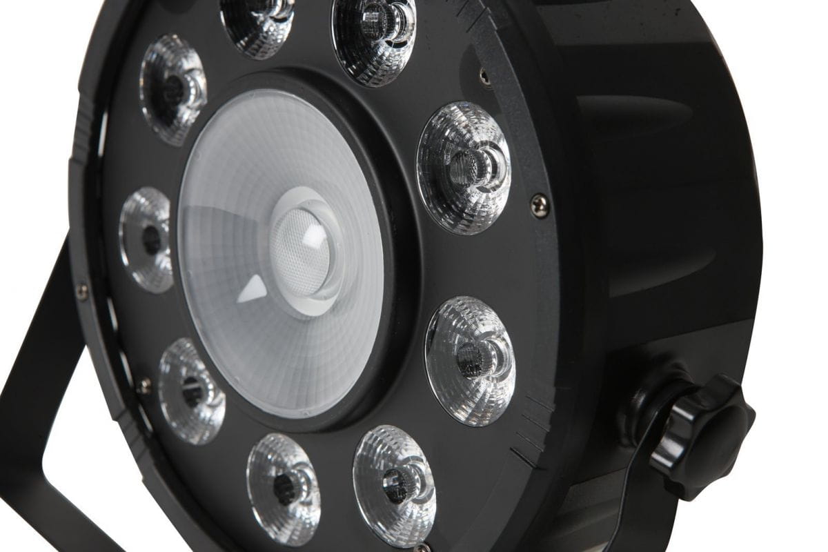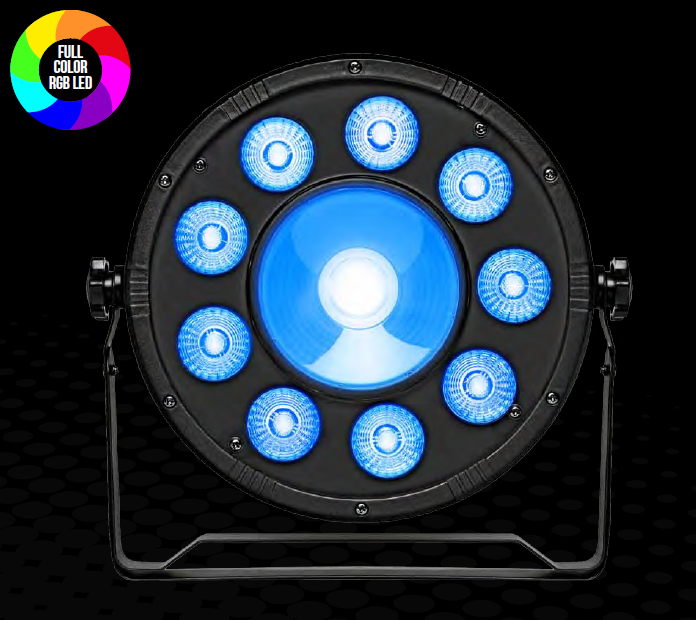 Kompaktowa lampa typu LED PAR wyposażona w dodatkową kontrolę centralnej diody RING. Urządzenie posiada aż 9 diod LED o mocy 10W każda (umieszczonych kształcie pierścienia) oraz centralną diodę (kolory: czerwony, niebieski, zielony, biały) 4 w 1 o mocy 20W. Lampa oferuje gotowe programy pracy, co znacznie skraca konfigurację w dowolnym typie instalacji. Jest to poręczna i lekka lampa o wysokiej wartości strumienia świetlnego, która może być sterowana w standardzie DMX.