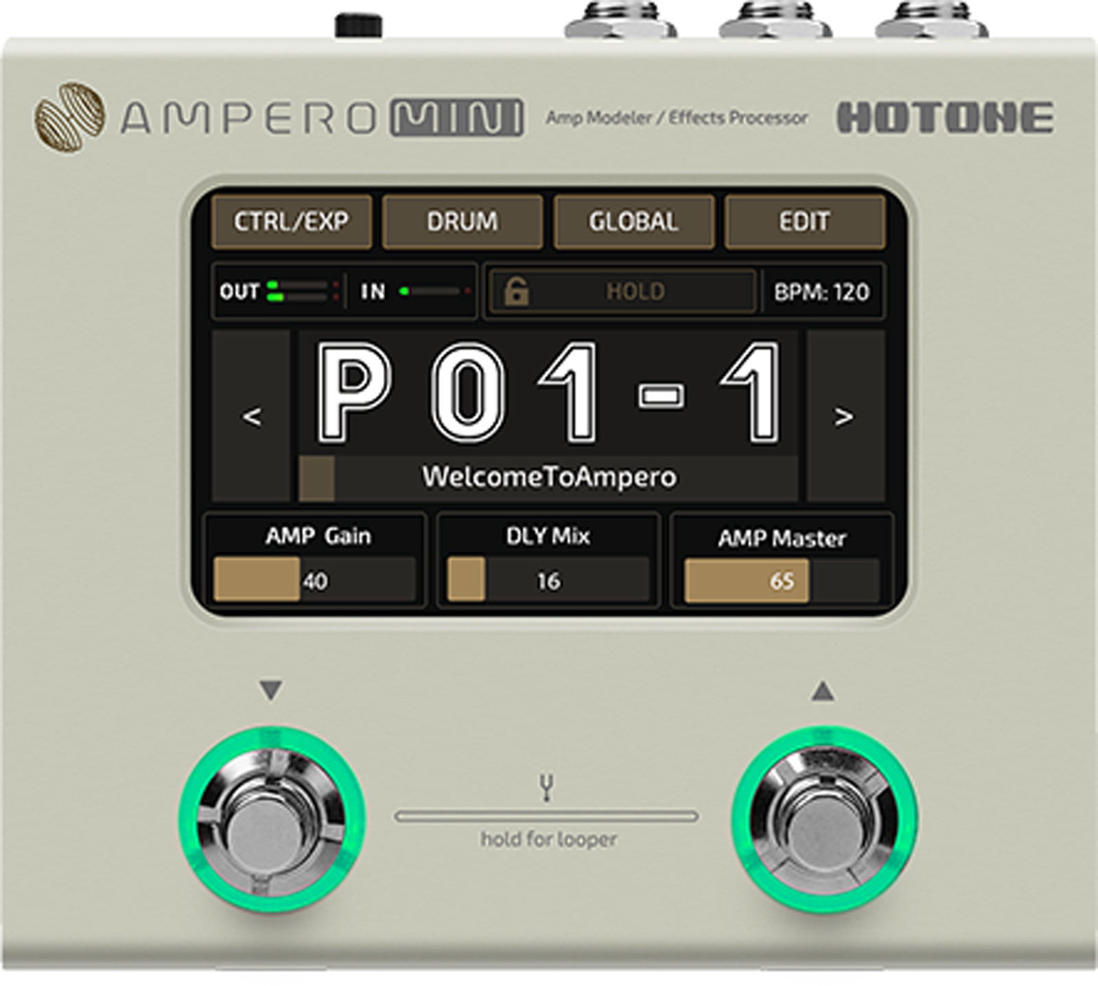 Hotone Ampero Mini stanowi połączenie ultra kompaktowych rozmiarów z doskonałym brzmieniem typowym dla rodziny Ampero. Ampero Mini to jak dotąd najmniejszy przedstawiciel rodziny Ampero. W kompaktowej aluminiowej obudowie kryje się jednak spory potencjał, ponieważ model ten oferuje tę samą bezkompromisową jakość dźwięku, co jego więksi krewni. Na wyposażeniu znajduje się imponująca liczba efektów z opcją obsługi odpowiedzi impulsowych (IR) innych producentów. Wbudowane gniazda wejść i wyjść spokojnie wystarczą do codziennego użytkowania. Z kolei obecność ekranu dotykowego i intuicyjność interfejsu użytkownika przekładają się na płynność obsługi tego multiefektu. Poziom jakości brzmienia jest tu identyczny, co w Ampero One. Ampero Mini zapewnia doskonałą wydajność w niższej cenie – co czyni z niego idealny wybór dla początkujących gitarzystów, którzy niejednokrotnie muszą brać pod uwagę kwestię budżetu. Hotone Ampero Mini polecamy również muzykom sesyjnym poszukującym kompromisu między niewielkim rozmiarem multiefektu gitarowego (czyli łatwością w zabieraniu z miejsca na miejsca) a profesjonalnym brzmieniem – z tego względu docenią go także doświadczeni weterani sceny.