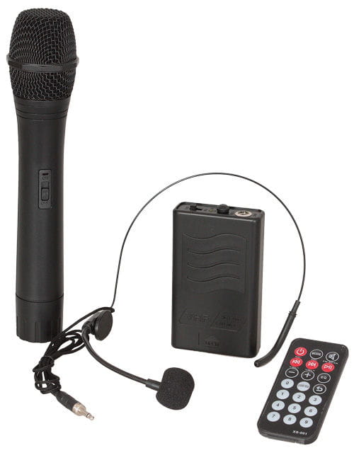 2x bezprzewodowy mikrofon VHF: 1x doręczny, 1x nagłowny