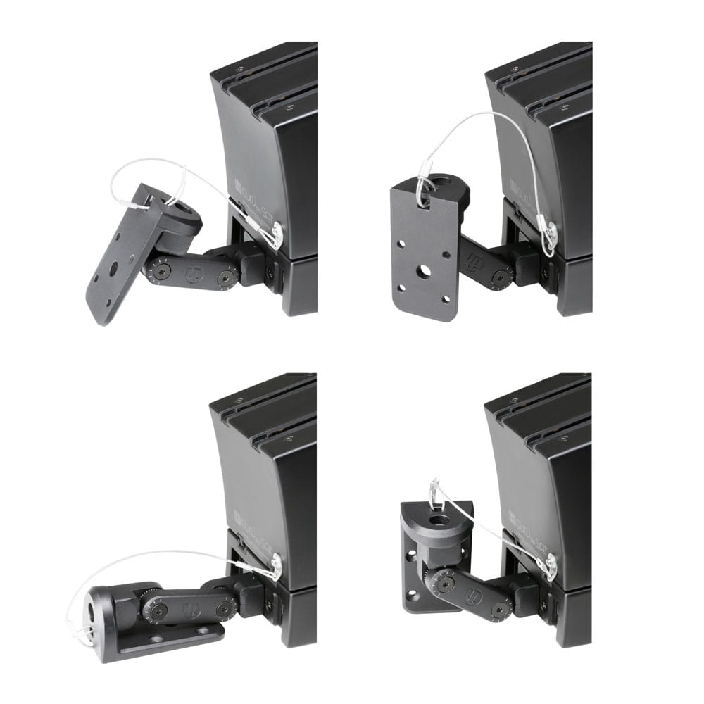 Uchwyt ścienny i sufitowy CURV 500 montuje się do adaptera SmartLink. Uchwyt jest zrobiony z powlekanego proszkowo i odlewanego ciśnieniowo aluminium. Poza tym posiada regulację w szerokim zakresie wzdłuż wszystkich osi i dzięki temu może zostać indy widualnie dopasowany. W zestawie uchwytu znajduje się stalowa lina zabezpieczająca o długości 20 cm do głośników satelitarnych CURV 500 zgodnie z przepisami BGV C1.