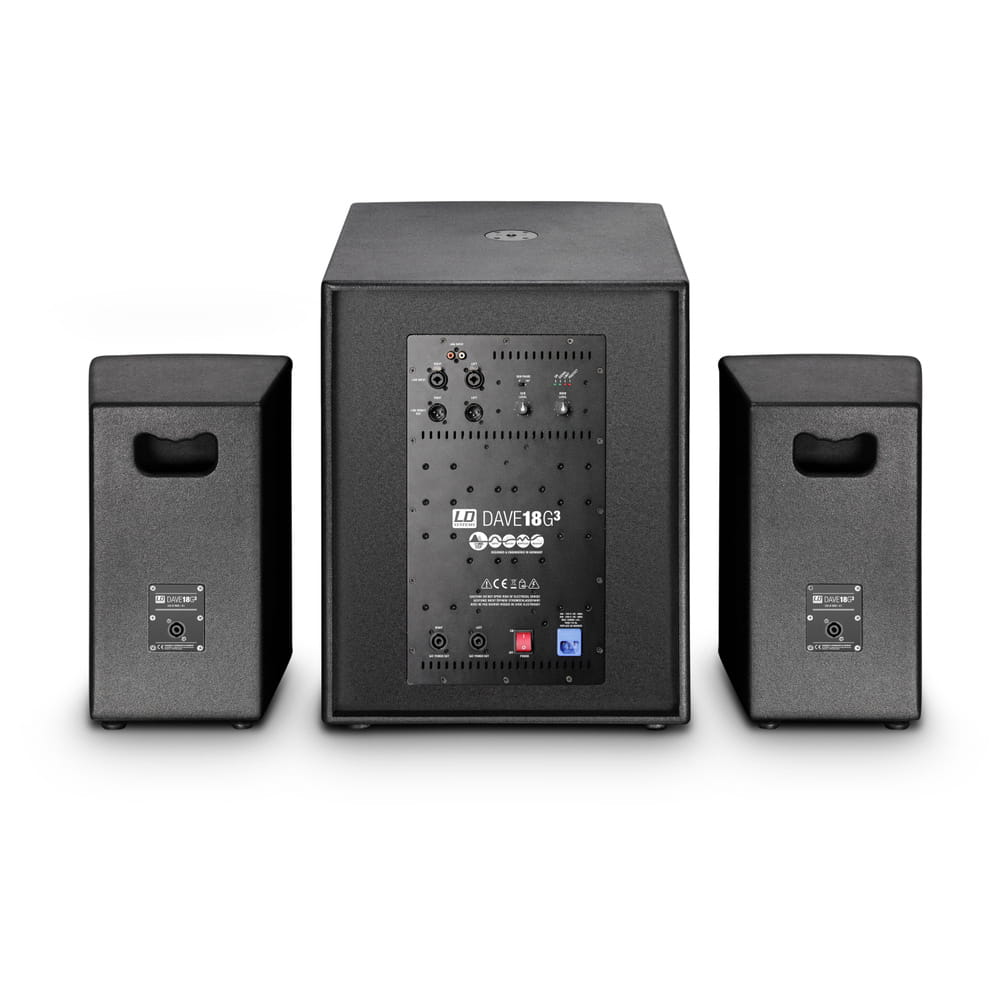 Zamknięte głośniki satelitarne wyposażone są w głośniki współosiowe 10”/1” i subwoofer w obudowie bass-reflex z głośnikiem 18” wyjściową 4800 W. Cyfr owe przetwarzanie dźwięku, limiter wielopasmowy oraz wyłączniki ochronne zabezpieczające przed zwarciem i przeciążeniem gwarantują znakomite brzmienie i niezawodne działanie. Poza tym subwoofer systemu DAVE 18 G3, dzięki wejściom XLR, jack 6,3 mm i c inch, może zostać podłączony do różnego rodzaju źródeł sygnału. Oprócz tego posiada niezależne regulacje poziomu w zakresie całego systemu i tonów niskich, włącznik odwracania fazy i zgodne ze standardem Speakon złącza głośników satelitarnych.