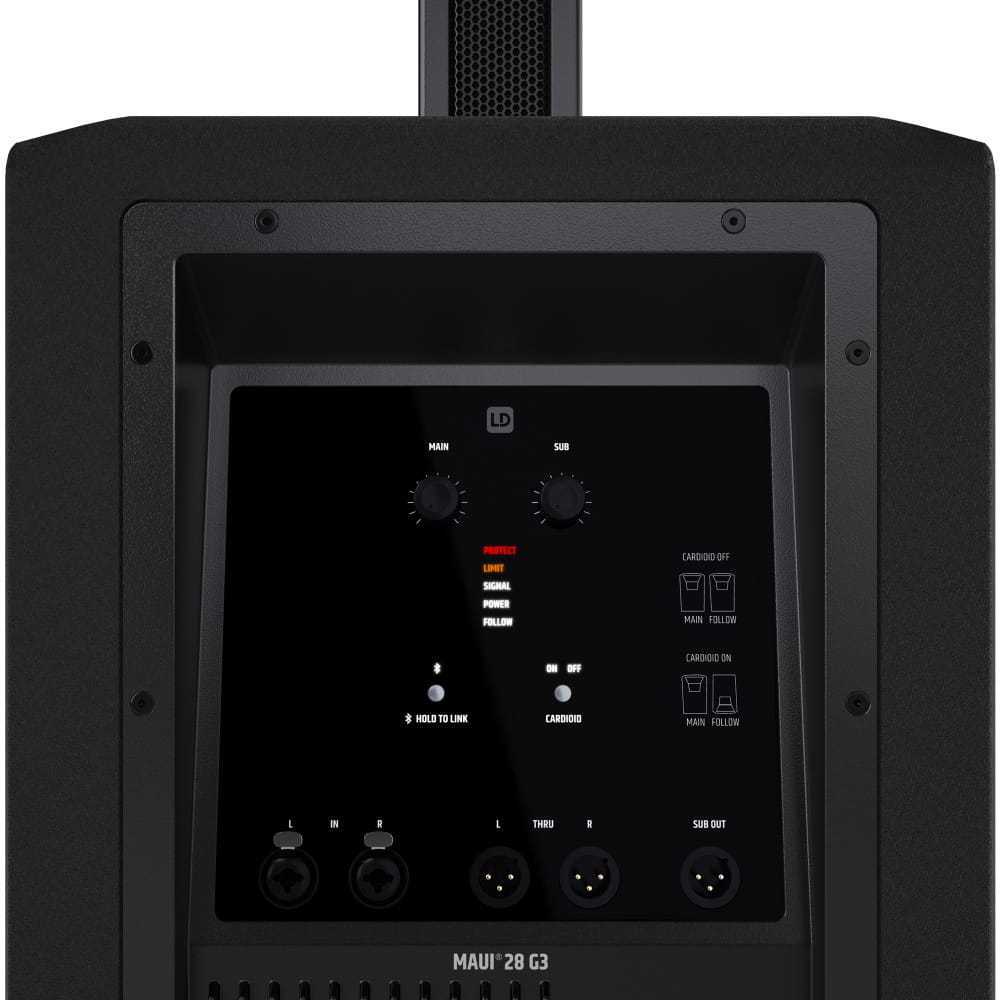 Wyposażony w pojedynczy 12'' głośnik niskotonowy i cztery porty bass reflex, subwoofer MAUI 28 G3 zapewnia czysty, zwarty i wyrazisty niski poziom brzmienia aż do 37 Hz. Dzięki zastosowaniu drugiego subwoofera można zwiększyć poziom niskich tonów nawet o 6 dB, a także ustawić go w konfiguracji kardioidalnej za pomocą jednego przycisku (ustawienie kardioidalne). Ponadto bardzo wytrzymała powłoka poliuretanowa subwoofera z łatwością wytrzymuje nawet najcięższe warunki na drodze.