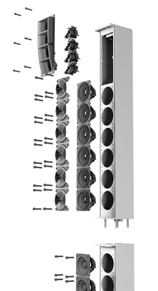 Jednorodna emisja dźwięku dzięki falowodowi głośników wysokotonowych zoptymalizowanemu metodą elementów brzegowych (BEM), soczewka akustyczna zapewniająca jednorodne czoło fali w zakresie średniotonowym, zoptymalizowane tunele bass-reflex;