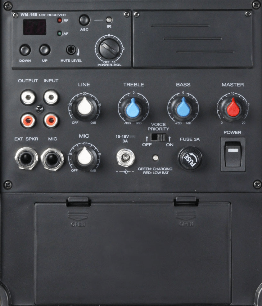 Elementy obsługi Bass , Line Gain , Master , Mic Gain , Power , Treble , Voice Priority On / Off