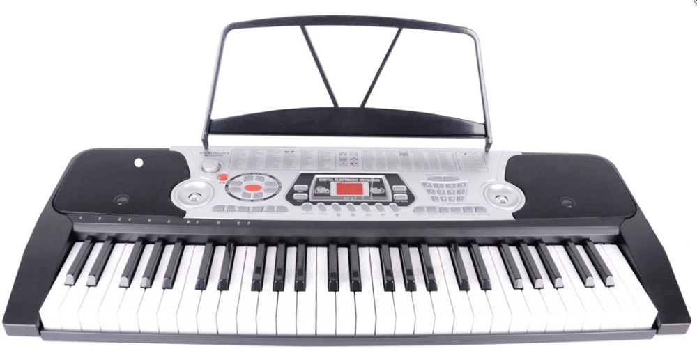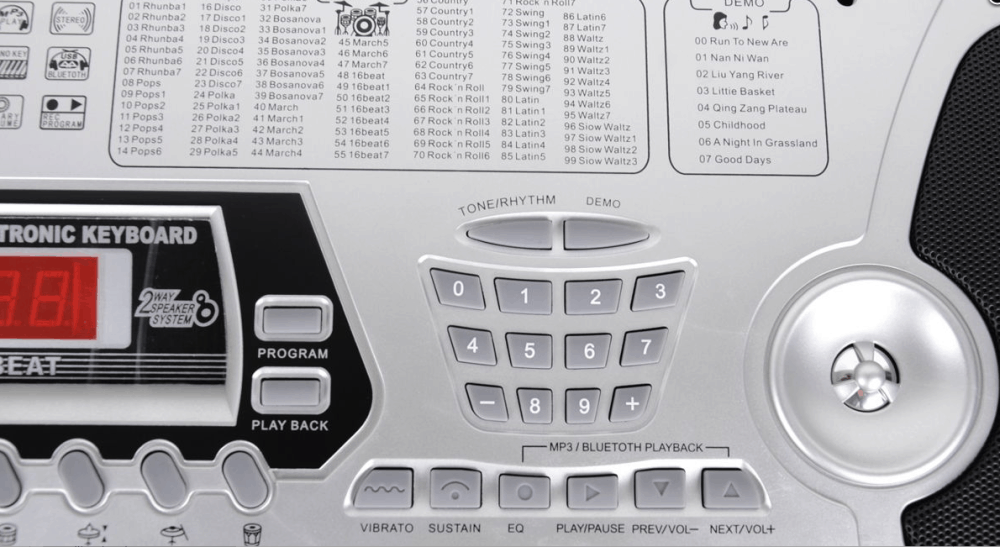 Klawisze posiadają Bluetooth do strumieniowania muzyki oraz port USB do odtwarzania podkładów bezpośrednio z naszego keyboardu. Wejście słuchawkowe umożliwi naszemu dziecku pracę na słuchawkach. Do dyspozycji mamy w urządzeniu różne podkłady perkusyjne oraz podstawowe funkcje keyboardowe, a także opcję podziału klawiatury i wiele podobnych. Keyboard posiada w zestawie zasilacz, pulpit na nuty oraz mikrofon.