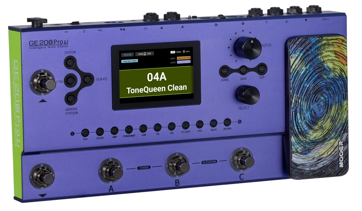 Sercem GE200 Pro jest duży 3,5-calowy kolorowy ekran LCD wysokiej jakości, który działa jako intuicyjny interfejs użytkownika, co sprawia, że nawigacja po rozbudowanych funkcjach efektu jest dziecinnie prosta. Pokrętło wyboru urządzenia można zarówno obracać, jak i naciskać, aby poruszać się po ekranie, podczas gdy charakterystyczne dla MOOER przyciski modułu szybkiego dostępu i zaprogramowane przełączniki nożne, znane użytkownikom serii GE, zapewniają, że kluczowe funkcje są zawsze w zasięgu ręki. Co więcej, GE200 Pro posiada także wbudowany pedał, który można skonfigurować jako regulator głośności lub pedał ekspresji efektu. Dodatkowo, gniazdo 1/4" stereo TRS urządzenia może być również użyte do podłączenia zewnętrznego pedału ekspresji. GE200 Pro posiada także tryb Groove Station, który zachęca do kreatywnej praktyki i pracy. Obejmuje on automat perkusyjny z 70 rytmami, metronomami i 60-sekundowym looperem frazowym, który można zsynchronizować z BPM.
