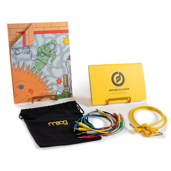 Zestaw Moog Sound Studio, 2 semi-modularne syntezatory analogowe [Mother-32 i perkusyjny DFAM], mikser sumujący stereo [4 IN], ramka montażowa 2 Tier Rack Kit z organizerem kabli, zestaw Patch Cabel Set, zestaw przewodników, grafika Philipa Lindemana