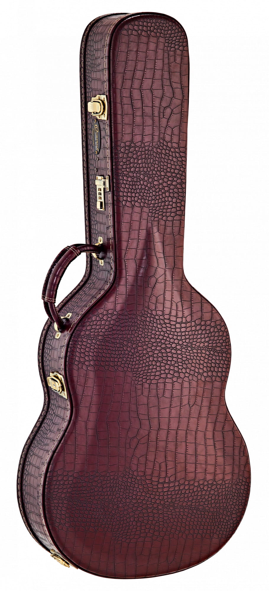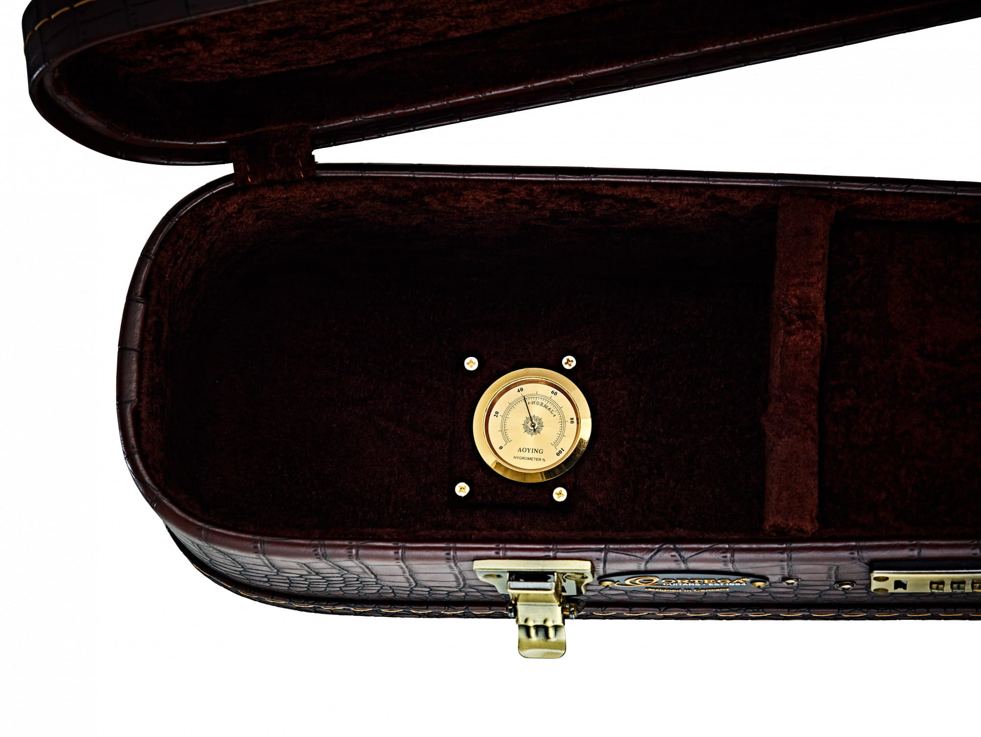 Niezwykłe, luksusowe futerały na instrumenty są wykończone nowoczesnym brązowym winylowym wykończeniem w stylu brown croco. Łukowata górna część obudowy, wyściółka o grubości 15 mm pokryta aksamitem, wbudowany higrometr, obszerna komora na akcesoria, zamek szyfrowy, okucia w stylu vintage bronze i wygodny, miękki uchwyt z podwójną rurką wyróżniają te ekskluzywne etui.