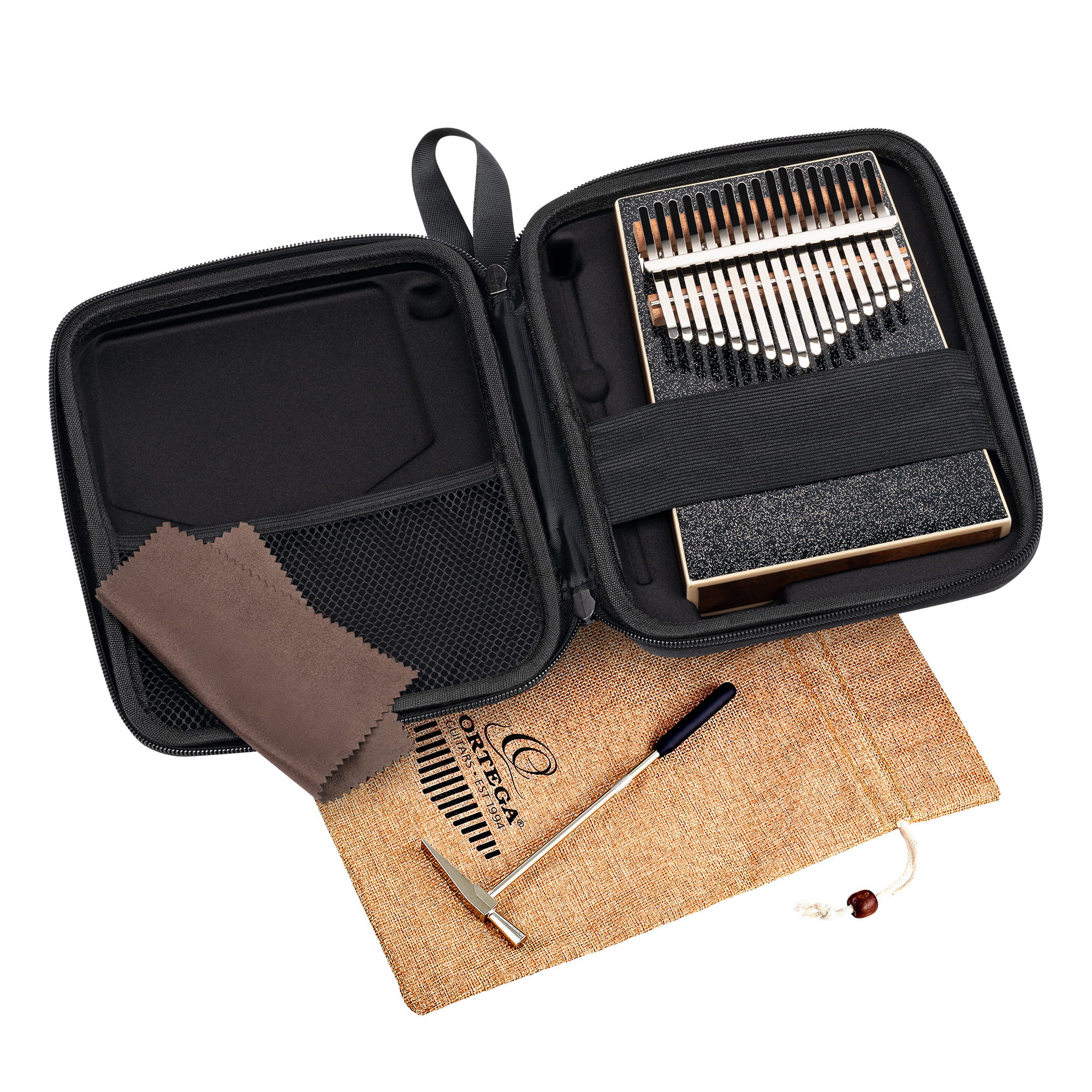 W zestawie z kalimbą ORTEGA OKB4-MBK znajdują się wszystkie niezbędne akcesoria: