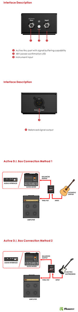 Zasilany napięciem phantom 48 V, ten DI-box wykorzystuje w pełni odseparowany, dyskretny układ elektroniczny z JFET-em o wyjątkowo wysokiej impedancji wejściowej, podwójnym buforem oraz transformatorem audio klasy studyjnej.