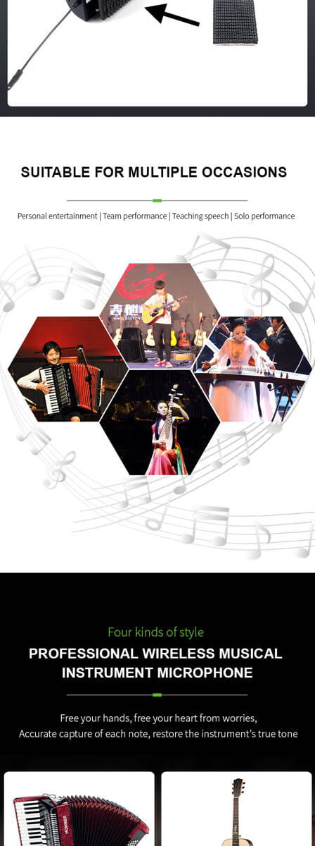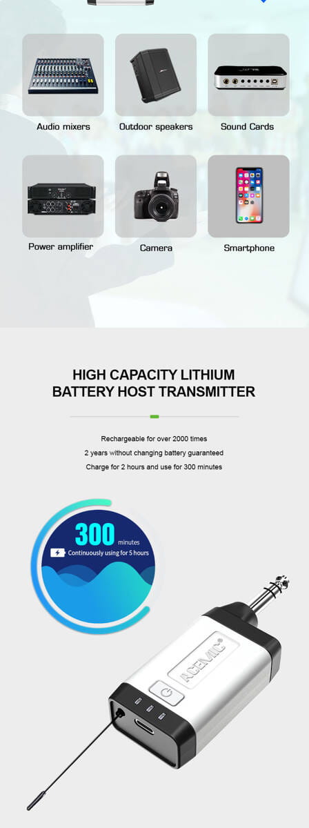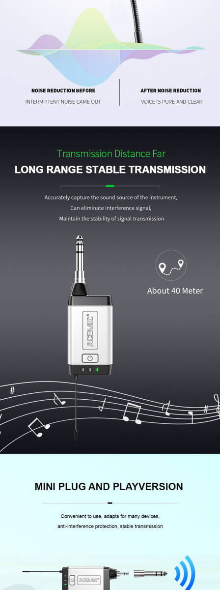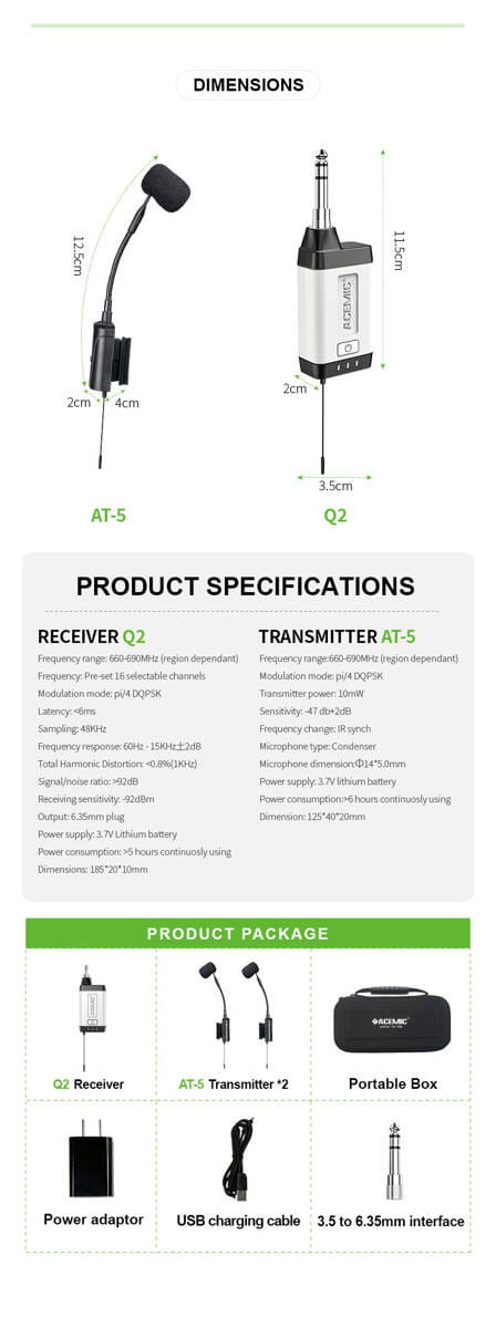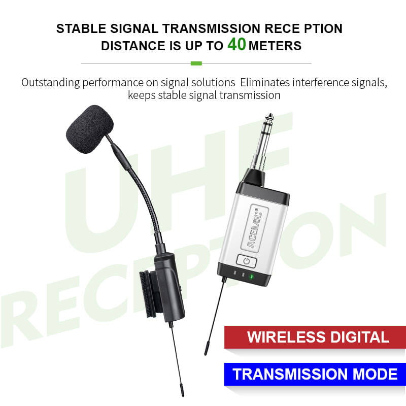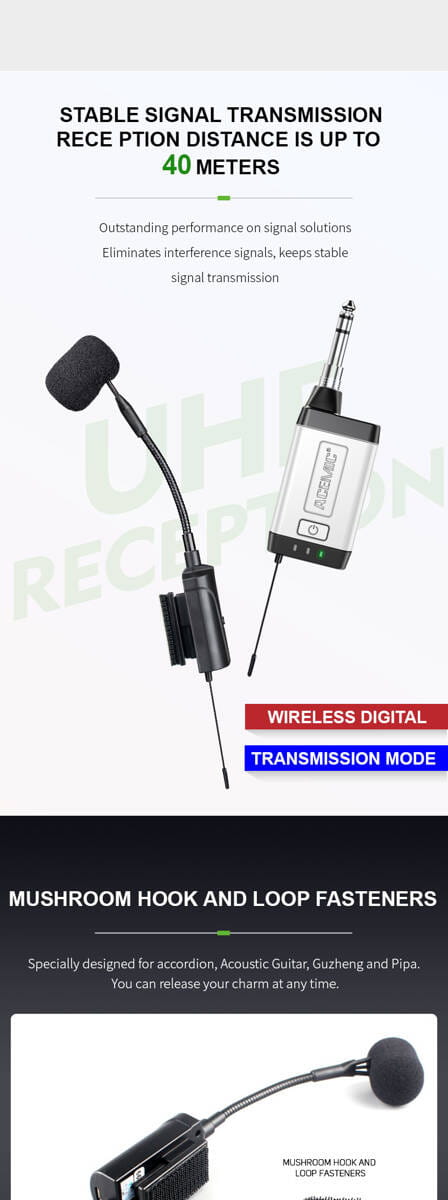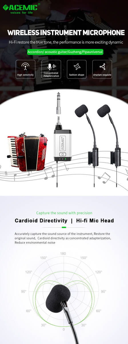 - Niezawodność i wydajność: Bezprzewodowy system mikrofonowy do akordeonu Acemic Q2/AT-5 gwarantuje niezawodność i wydajność. Dzięki żywotności baterii do 6 godzin zapewnia długotrwałe i stabilne działanie podczas koncertów i innych wystąpień. Zasięg działania do 50 metrów daje swobodę ruchu, co jest niezwykle istotne dla artystów.
