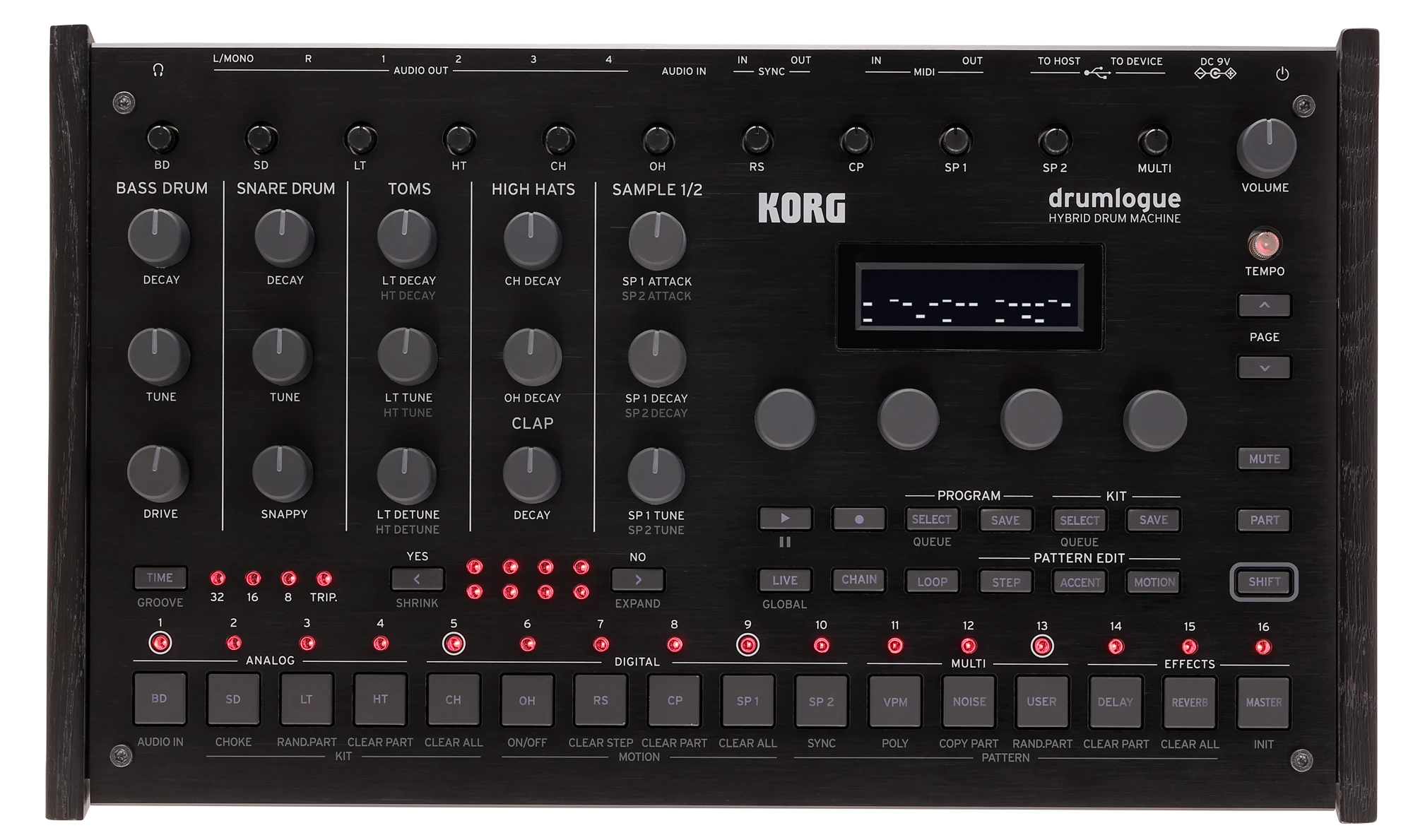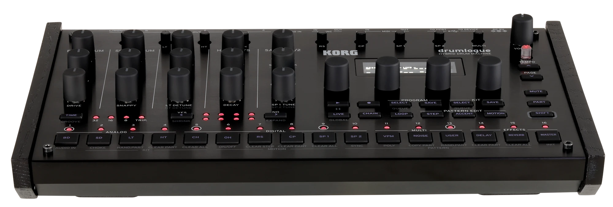 Potrójnie hybrydowa maszyna perkusyjna, która oferuje zarówno analogowe, jak i cyfrowe formy syntezy, a także generowanie dźwięku oparte na samplach, zapewniając najlepsze elektroniczne rytmy bez kompromisów. Dzięki temu drumlogue pozwala uzyskać pulsujące bębny, groove'owe perkusje i mocne basy, a nawet polifoniczne akordy – i to wszystko jednocześnie! Jest to możliwe dzięki 11-głosowej polifonii (4 partie analogowe, 6 partii opartych na samplach + 1 silnik Multi z syntezą VPM, generatorem szumu i syntezatorem niestandardowym). Aby drumlogue brzmiał aktualnie nawet po latach, można importować własne sample. Znany z minilogue xd i prologue logue SDK został znacznie rozbudowany i oferuje teraz możliwość załadowania do automatu perkusyjnego kompletnych syntezatorów niestandardowych, które w zależności od wersji mogą być nawet polifoniczne.