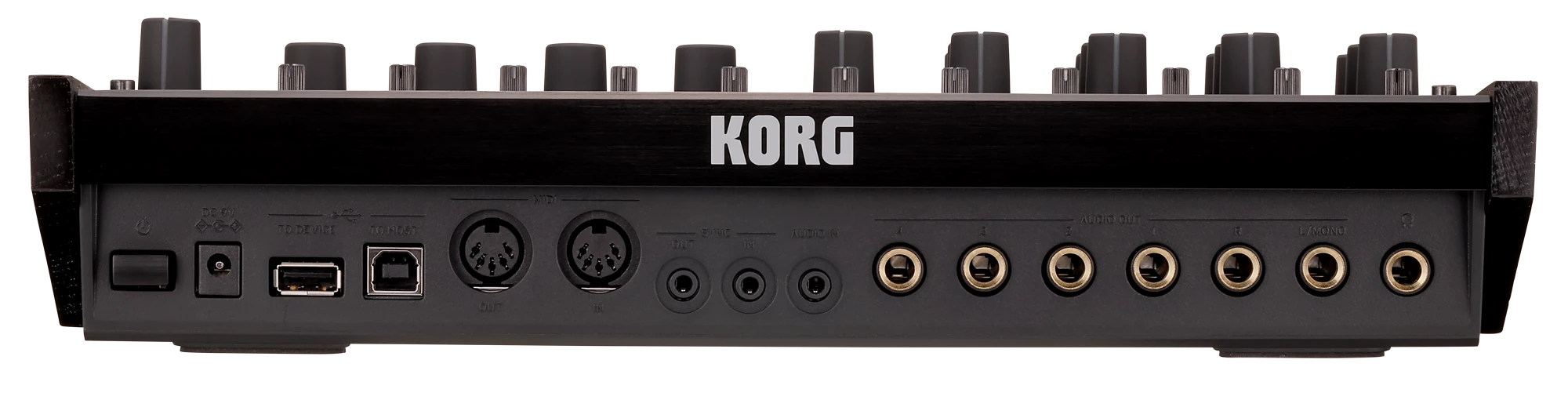 Złącza: słuchawki, OUTPUT (L/MONO, R, AUDIO OUT 1-4), SYNC IN/OUT, AUDIO IN, MIDI IN/OUT, USB A (do urządzenia – tylko dla kontrolera MIDI), USB B (do hosta)