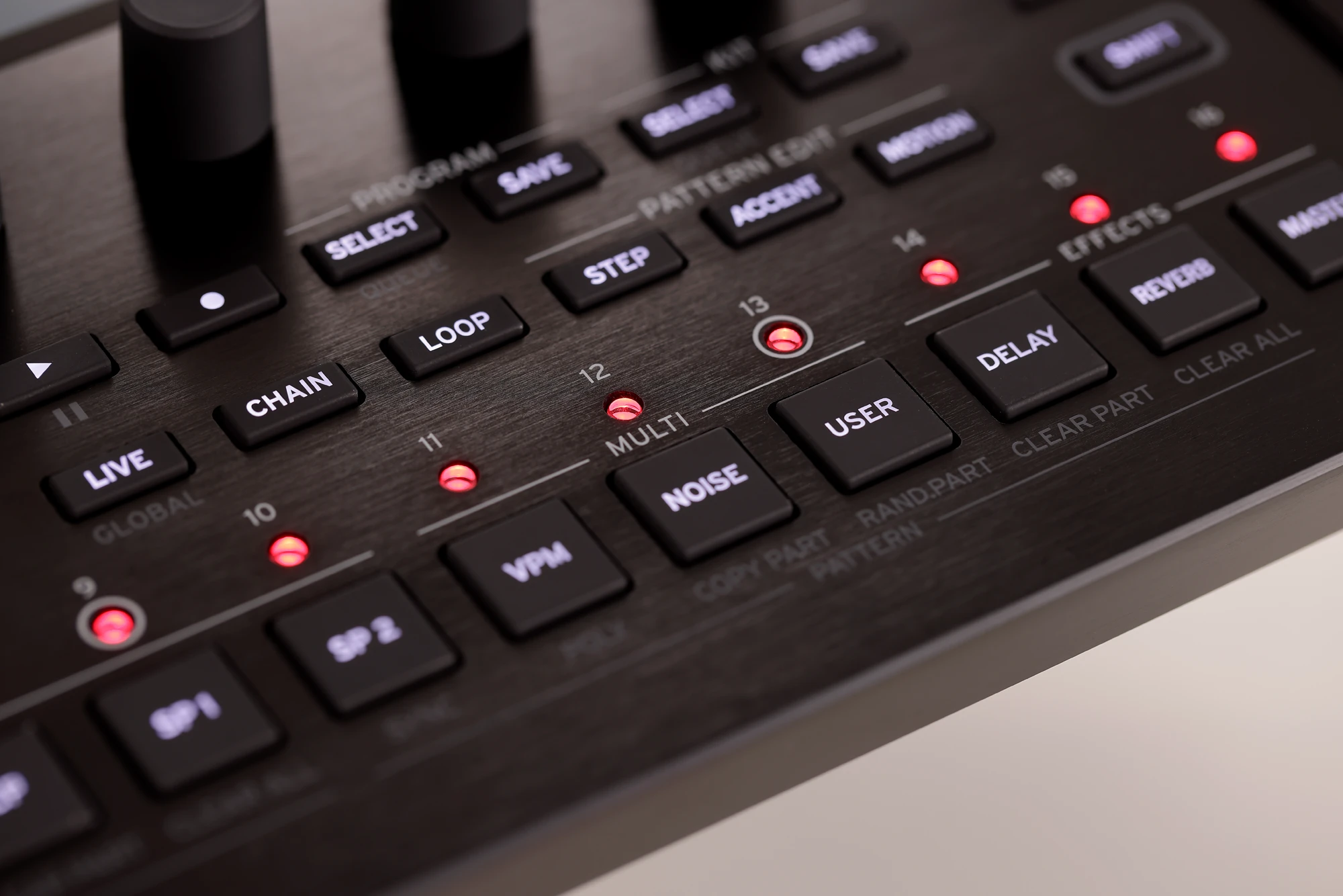 Fabrycznie zainstalowany jest wirtualno-analogowy plug-in syntezatora „Nano”, który został opracowany we współpracy ze znaną firmą programistyczną Sinevibes. Trzy i tak już wszechstronne bloki efektów Reverb, Delay i Master można również rozszerzyć o dodatkowe efekty niestandardowe. Najważniejsze parametry kształtujące brzmienie są zawsze dostępne bezpośrednio z przejrzystego panelu sterowania, podobnie jak indywidualne regulatory głośności dla każdej z 11 partii.