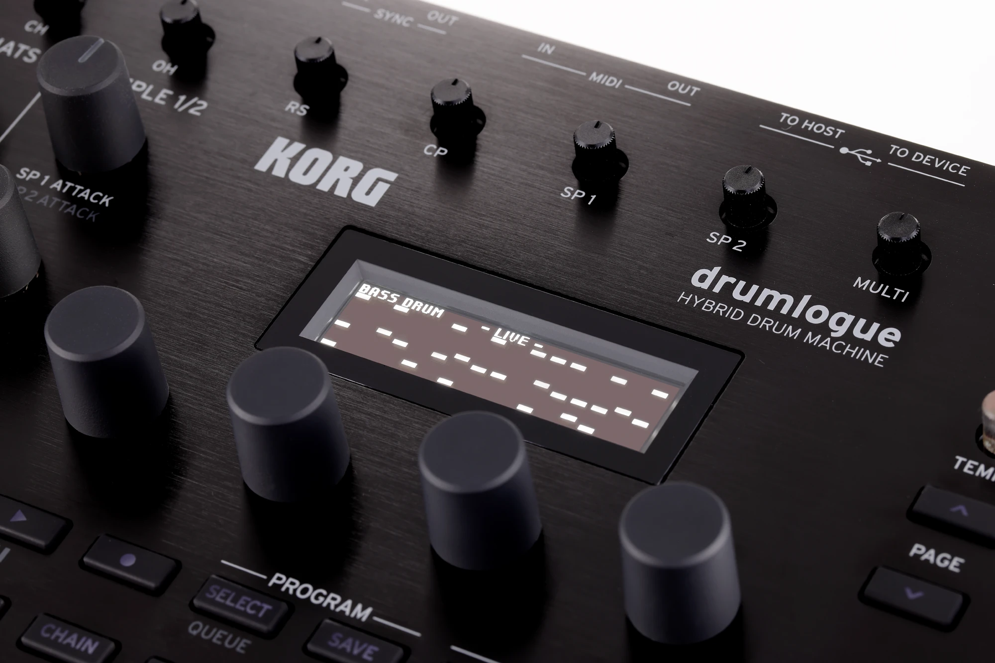 Pod względem połączeń drumlogue oferuje między innymi 2 główne i 4 dowolnie przypisywane wyjścia indywidualne, wejście audio, MIDI IN/OUT oraz USB A i USB B. Wydajny sekwencer drumlogue ma 64 kroki i wiele inteligentnych funkcji, dzięki którym zaprogramowane groove'y mogą ożywać w dynamiczny sposób. Wyraźny wyświetlacz OLED zapewnia ciągłą informację zwrotną na temat aktywnych sekwencji i wartości parametrów. drumlogue inspiruje dzięki swoim mocnym, nowoczesnym brzmieniom, wszechstronnemu sekwencerowi, indywidualnej rozbudowie i nie tylko, ale także dzięki wrażeniom dotykowym podczas programowania i wykonywania.