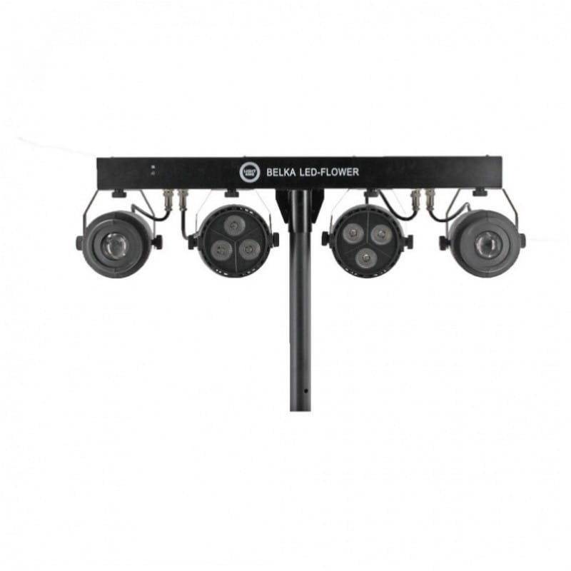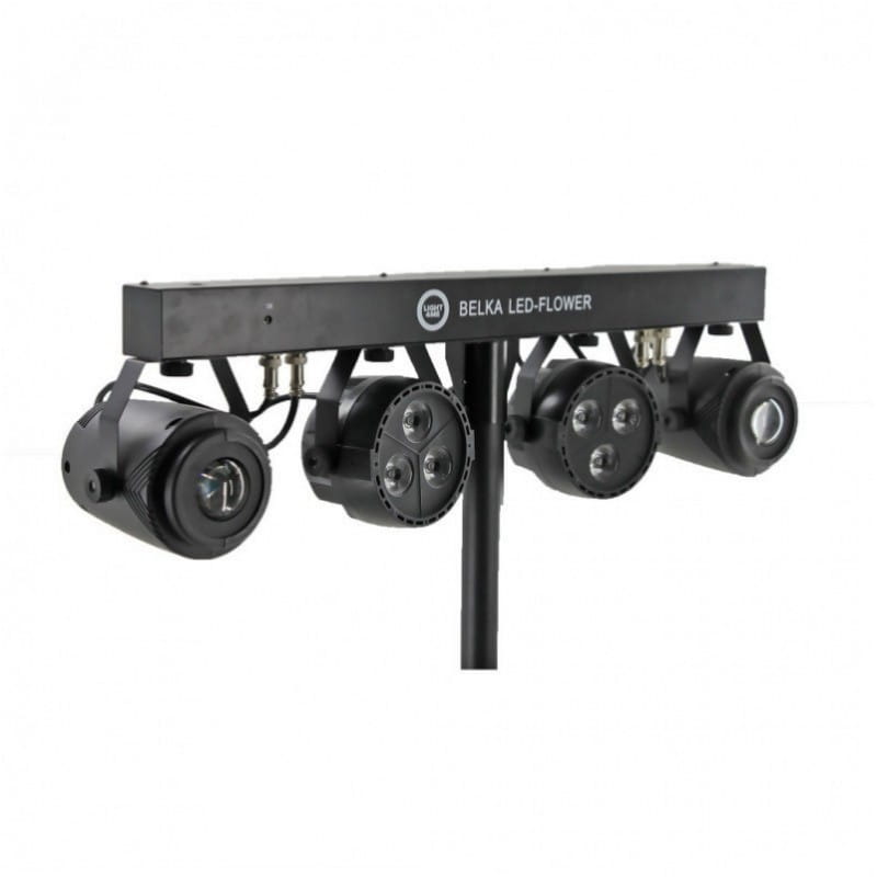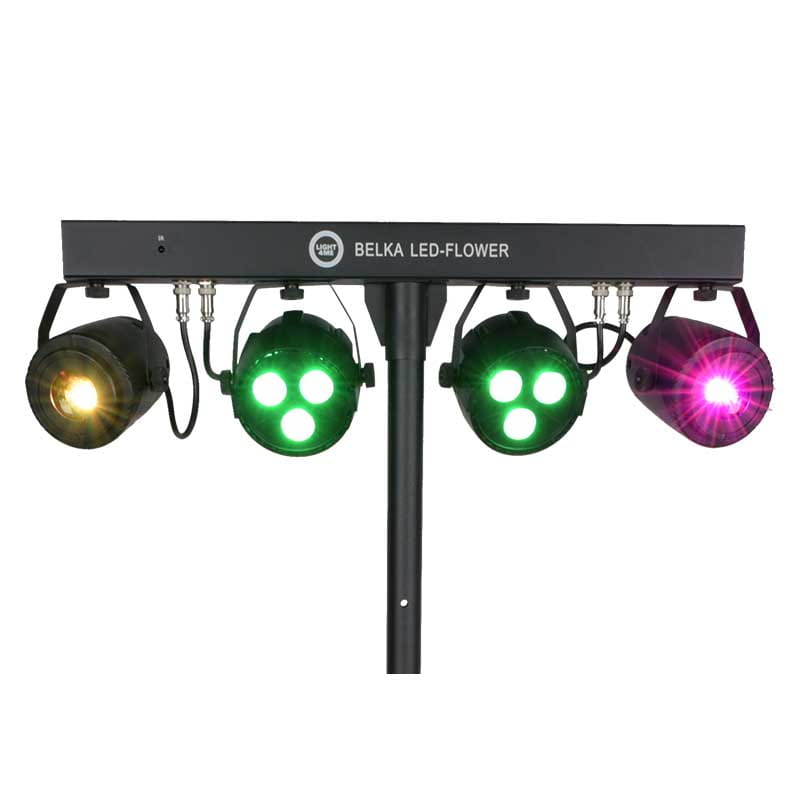 LIGHT4ME BELKA LED FLOWER jest idealnym zestawem przenonym dla mobilnego DJa lub zespołu muzycznego. Można go z powodzeniem używać jako oświetlenia scenicznego małej i średniej estrady, w dyskotekach, pubach albo po prostu w miejscach, w których zachodzi potrzeba użycia efektów świetlnych.W komplecie znajdują się wytrzymały statyw, listwa mocująca oraz dwa wielokolorowe reflektory LED PAR 12x1W RGBW i dwa efekty oświetleniowe LED flower 1x10W RGBW podłączone na stałe do belki, zapewniające szeroki kąt świecenia. Pracę całości możemy kontrolować ręczenie wykorzystując znajdujący się na listwie panel sterowania LED i cztery przyciski Menu, Up, Down, Enter, za pośrednictwem bezprzewodowego pilota lub za pomocą sterowników DMX gniazda inout. Urządzenie posiada również wbudowany tryb pracy automatycznej i sterowania dźwiękiem wbudowany mikrofon.Zestaw jest bardzo mobilny jego małe rozmiary, niska waga oraz fakt, że całość mieści się w dwóch pokrowcach statyw belka sprawiają, że to idealne rozwiązanie na każdą scenę. Specyfikacja technicznaŹródło światła 2 reflektory LED typu par 12x1W po 3 diody w jednym z kolorów RGBWŹródło światła 2 efekty LED typu flower 1x10W RGBWKanały DMX 3615Tryby pracy auto, sound, masterslave, DMXDimmer 0100Złącza 3pin XLRWejście zasilania IECRegulowana wysokość statywu takZużycie energii 60WZasilanie AC 100240V, 5060HzBezpiecznik 3AWymiary bez statywu 200 x 750 x 165 mmWaga 5,7 kgOryginalne opakowanie i wypełnienie.