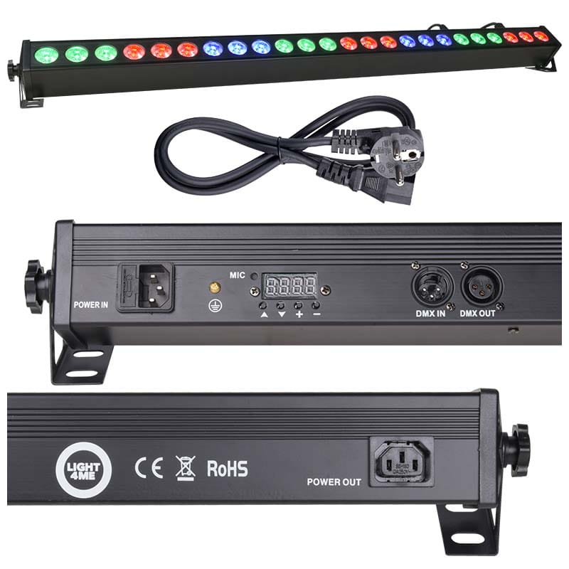 Belka LED RGBLight4Me Deco Barnbsp24 RGB to profesjonalna belka LED do dekoracji światłem i tworzenia efektoew scenicznych. Idealnie sprawdza się jako oświetlenie podczas koncertoew, występoew estradowych, na salach weselnych, w klubach tanecznych i dyskotekach, a także w pubach, hotelach, restauracjach oraz jako oświetlenie dla DJoew, zespołoew i firm eventowych.W zestawie 8sekcyjna listwa LED Light4Me Deco Bar 24 RGB uchwyty i śruby montażowe przewoed zasilający IEC instrukcja obsługi ENPLnbsp Łatwość obsługi i roeżne tryby pracyListwa LED Light4Me Deco Bar wyposażona została w 24 mocne, 3watowe diody po 3 w 8 sekcjach, operujące światłem w palecie barw RGB. Na tylnym panelu znajdują się gniazda zasilania w tym tzw. bdquopodaj dalej umożliwiające przekazywanie napięcia bezpośrednio z urządzenia do urządzenia, wejście i wyjście DMX oraz panel sterowania z cyfrowym wyświetlaczem i czterema przyciskami. Za ich pomocą możemy zmieniać ustawienia w menu, a także wybrać jeden z czterech interesujących nas tryboew pracy auto, w ktoerym belka LED pracuje autonomicznie w oparciu o wbudowane programy pracy i style świecenia sound, w ktoerym oświetlenie sceniczne synchronizuje swoje działanie z rytmem i dźwiękami muzyki pochodzącymi z otoczenia, za pomocą czułego mikrofonu zainstalowanego w korpusie obudowy masterslave, w ktoerym jednostki łączone są ze sobą za pomocą przewodoew DMX, a praca pierwszego led bara w linii przekłada się na synchroniczną pracę całego zespołu DMX, kiedy do sterowania pojedynczym oświetlaczem liniowym LED lub zespołem jednostek stosowane są zewnętrzne kontrolery oświetlenia.nbsp Oświetlenie sceniczne i dekoracja światłemLed bar Light4Me Deco to ciekawa propozycja dla osoeb poszukujących dobrego, ale jednocześnie konkurencyjnego cenowo oświetlenia do dekoracji światłem, ktoere będzie łatwe w obsłudze i do tego bardzo mobilne. Listwa LED oferuje wszystko, czego potrzebujesz, aby stworzyć idealny show podczas każdej imprezy. Najlepszą cenę, szybką realizację zamoewienia i wysyłkę gwarantuje sklep muzyczny Music Express!nbspSpecyfikacja techniczna Zasilanie AC90240V, 5060 Hz Poboer mocy 80W Bezpiecznik 3A Źroedło światła 24x3W LED RGB po 3 w 8 sekcjach Wspoełczynnik oddawania barw Ra 95 Kąt świecenia 25deg Dimmer liniowy 0100 Ilość kanałoew DMX 2, 3, 4, 6, 7, 12, 24 Tryby pracy auto, sound, masterslave, DMX512 Stopień ochrony IP33 Złącze DMX 3stykowe XLR inout Złącze zasilania IEC Temperatura pracy 20degC 40degC Wymiary listwy 105 x 6,5nbspx 8 cm Wymiary kartonu 112 x 11nbspx 11nbspcm Waga 2,5 kg W zestawie listwa LED bar, przewoed zasilający, uchwyty montażowe, instrukcja obsługiOryginalne opakowanie i wypełnienie.