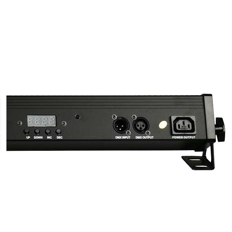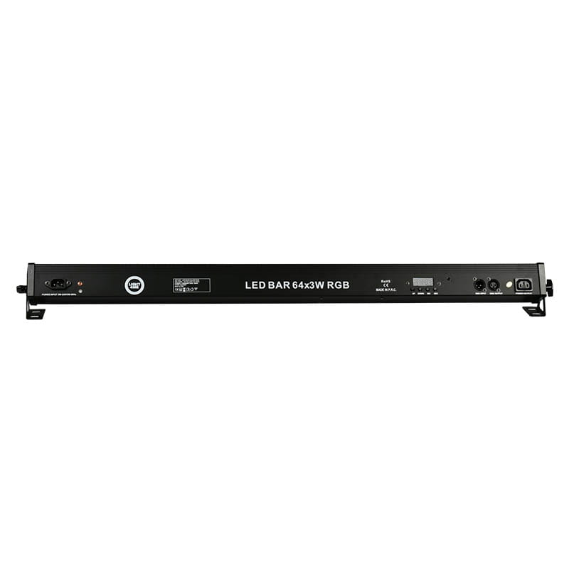 LIGHT4ME LED BAR 64X3W RGB to 8sekcyjny, profesjonalny nawietlacz liniowy z możliwością sterowania za pomocą bezprzewodowego pilota, wyposażony w 64 mocne, 3watowe diody LED operujące światłem w palecie koloroew RGB. Ledowa listwa znakomicie sprawdza się na roeżnego typu scenach, w dekoracji światłem wnętrz restauracyjnych, hotelowych, sali weselnych, a także elementoew architektury. Dzięki podziałowi na 8 sekcji można ją roewnież wykorzystać jako element efektowy czy do stworzenia ciekawej piksel mapy.Komponenty oświetlacza LED zamknięte zostały w podłużnej obudowie. Na obu jej końcach znajdują się otwory umożliwiające zamontowanie podstaw, dzięki ktoerym belkanbspmoże pracować w pozycji stojącej lub wiszącej. Uchwyty pozwalają roewnież ustawić listwę LED pod odpowiednim kątem w stosunku do oświetlanej powierzchni. W goernej części led bara zainstalowane są 64 diody rozmieszczone w dwoech rzędach. Na jednym z bokoew mieszczą się gniazda zasilania w tym tzw. bdquopodaj dalej umożliwiające podawanie napięcia bezpośrednio z urządzenia do urządzenia, 3pinowe wejście i wyjście XLR dla sygnałoew DMX oraz panel sterowania w postaci czterech przyciskoew i cyfrowego wyświetlacza LED. Za ich pomocą możemy ustawić kolor statyczny, ktoerym wall washer będzie oświetlał interesującą nas powierzchnię, lub wybrać jeden z czterech tryboew pracy urządzenia auto, w ktoerym oświetlacz LED będzie pracował samodzielnie w oparciu o jeden z 13 wbudowanych programoew automatycznych sound, w ktoerym reflektor liniowy zsynchronizuje swoja pracę z dźwiękami muzyki płynącymi z otoczenia dzięki wbudowanemu, bardzo czułemu mikrofonowi masterslave, gdy led stripy łączone są za pośrednictwem gniazd i przewodoew DMX w sposoeb szeregowy, a pierwsze urządzenie w linii określa sposoeb działania wszystkich jednostek DMX, kiedy do kontrolowania pracy jednego lub grupy podświetlaczy LED wykorzystywane są zewnętrzne sterowniki, pulpity lub konsole.LIGHT4ME LED BAR 64x3W RGB to bez wątpienia jedna z ciekawszych propozycji zdalnie sterowanego liniowego oświetlacza w sklepie muzycznym Music Express. Dwa rzędy 32 diod, szeroki kąt świecenia wynoszący 40deg, funkcja stroboskopu, a także żywe i nasycone kolory odwzorowywane na oświetlanej powierzchni tworzą z niego doskonałe oświetlenie sceniczne. Belka LED znakomicie sprawdza się podczas koncertoew live, a także w dyskotekach i klubach muzycznych. Jest też świetnym narzędziem realizującym oświetlenie dekoracyjne na wszelkiego typu imprezach okolicznościowych, galach i eventach.nbspnbspSpecyfikacja techniczna Źroedło światła 64x3W RGB 3w1 LED Podział na sekcje 8 sekcji po 8 diod Zasilanie AC100220V, 5060Hz Zużycie energii 198W Kąt świecenia 40deg Gniazda DMX 3pinowe wejście i wyjście typu XLR Gniazda zasilania IEC Obudowa czarna, aluminiowa Miejsce pracy wnętrza Temperatura pracy 20degC 45degC Dopuszczalna wilgotność 0 90 Panel sterowania wyświetlacz LED 4 przyciski Zdalne sterowanie pilot bezprzewodowy na podczerwień IR Kanały DMX 23471426 Tryby pracynbspauto, sound, masterslave, DMX, kolor statyczny Ilość wbudowanych programoew pracy 13 Wymiary 1020 x 70 x 75 mm Waga 2,2 kg W zestawie uchwyty montażowe, pilot IROryginalne opakowanie i wypełnienie.