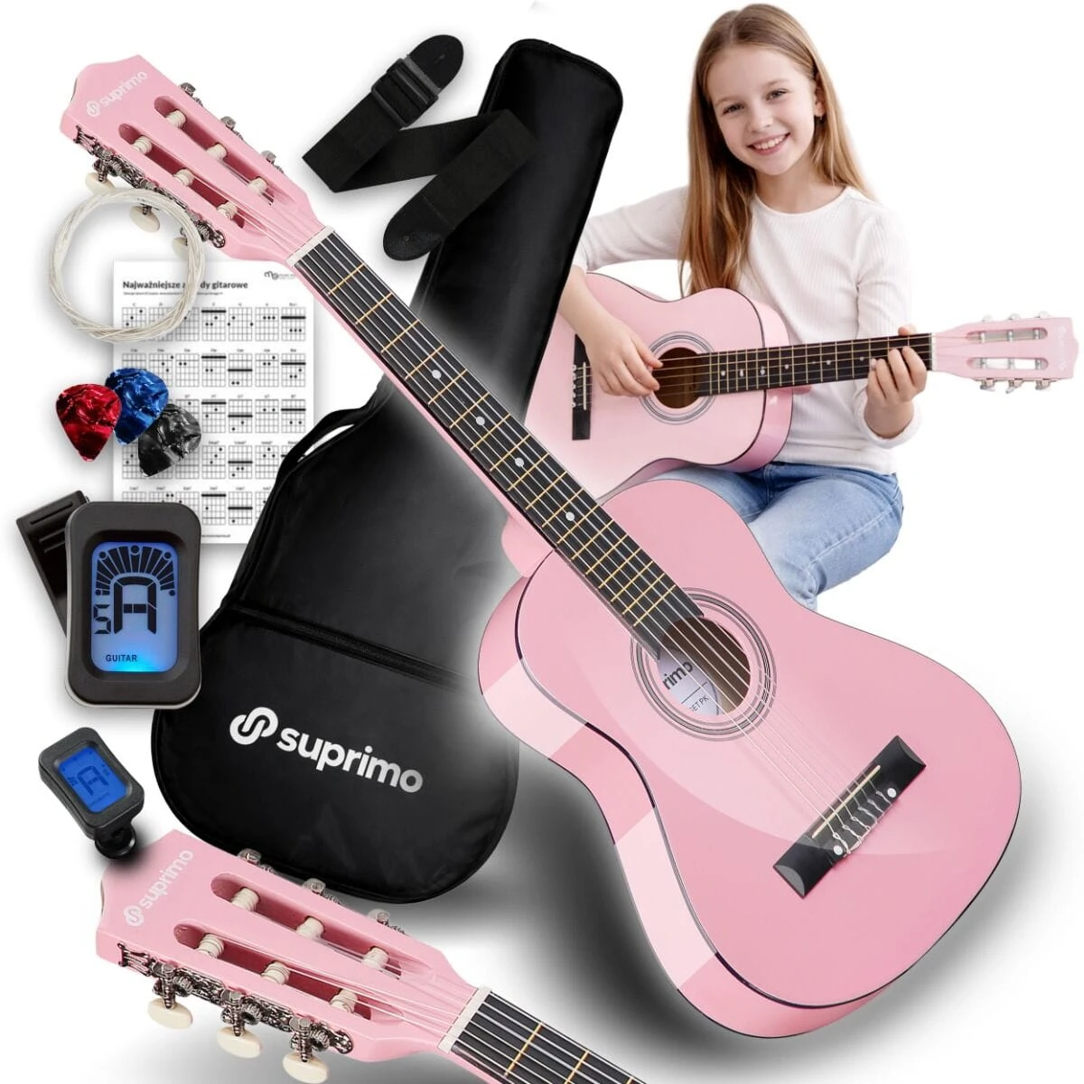 SUPRIMO JRC SET PK GITARA KLASYCZNA 1/4 RÓŻOWA PASEK ZAPASOWE STRUNY POKROWIEC TUNER AKORDY ZESTAW