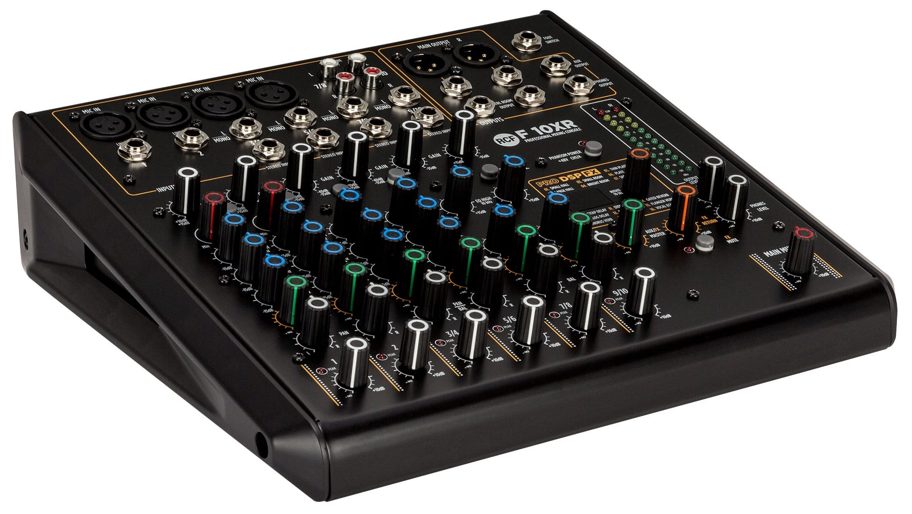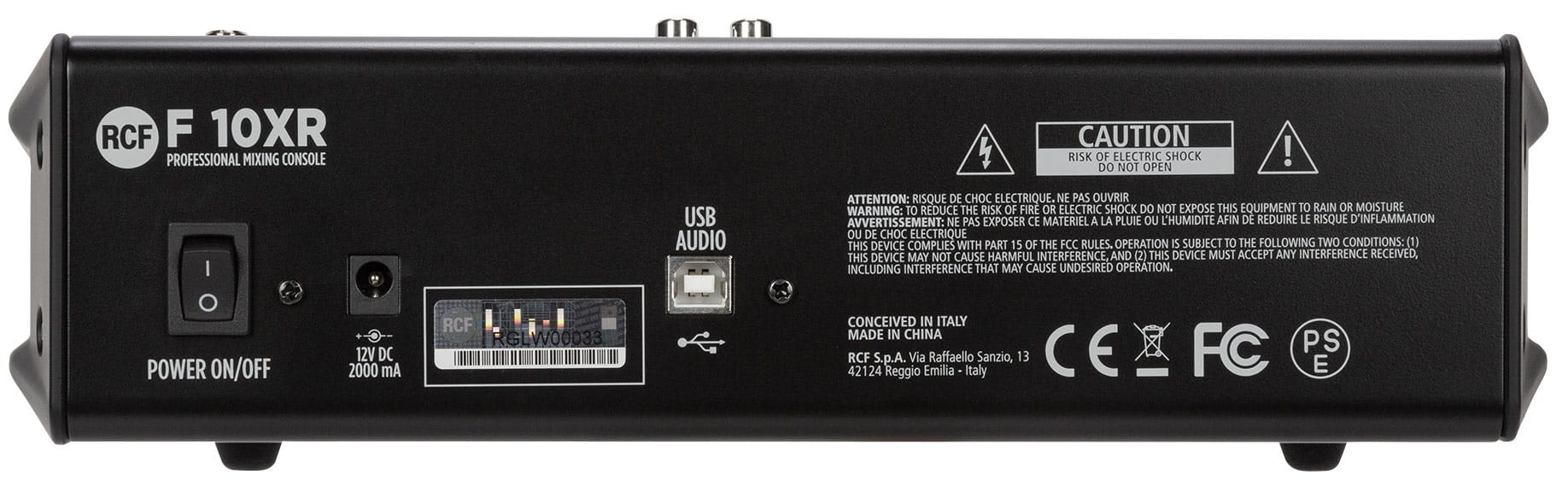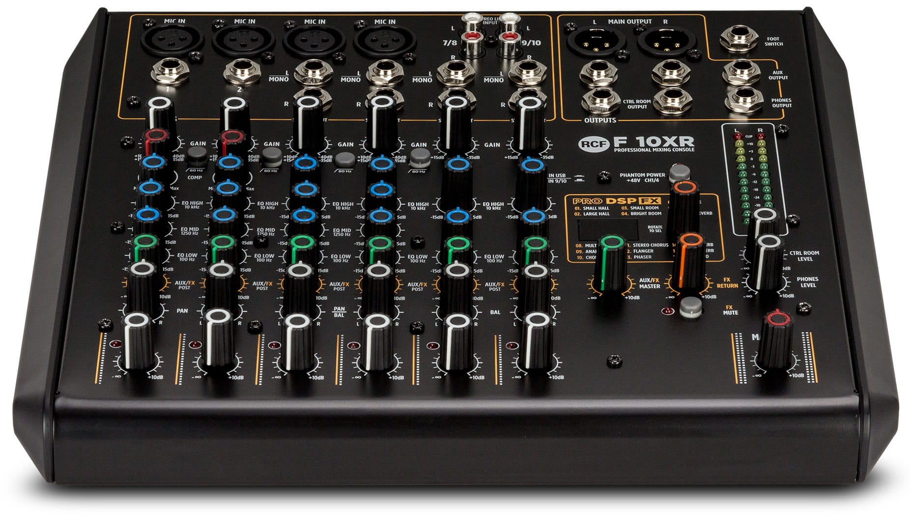 RCF F10XR - To mikser bazujący na bogatym analogowym brzmieniu profesjonalnej serii mikserów RCF E z estetycznym intuicyjnym panelem, wysokiej jakości komponentami, które pomogą zmiksować muzykę z najlepszym wynikiem jakości przy minimalnym doświadczeniu technicznym realizatora. Umieszczony w solidnej metalowej obudowie opiera się na w pełni symetrycznej i niskoszumowej ścieżce audio od wejścia do wyjścia z pojedynczymi kompresorami sterującymi w celu ograniczenia szczytowych wartości sygnału. Posiada trzy pasmowy EQ na wejściach mikrofonowych oraz 2 pasmowy na kanałach stereo. Wysokiej jakości efekty FX, wyjście AUX oraz złącze USB do rejestrowania miksu oraz odtwarzania plików audio.