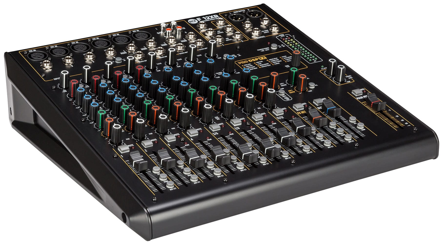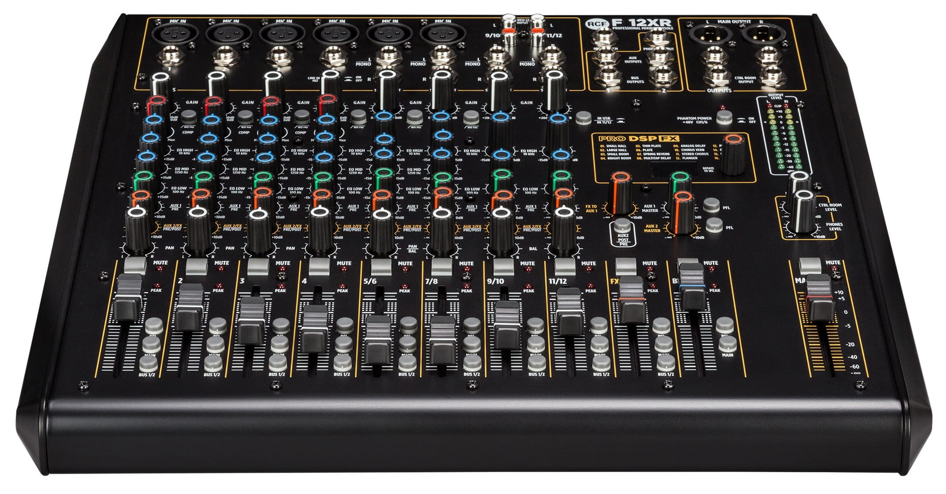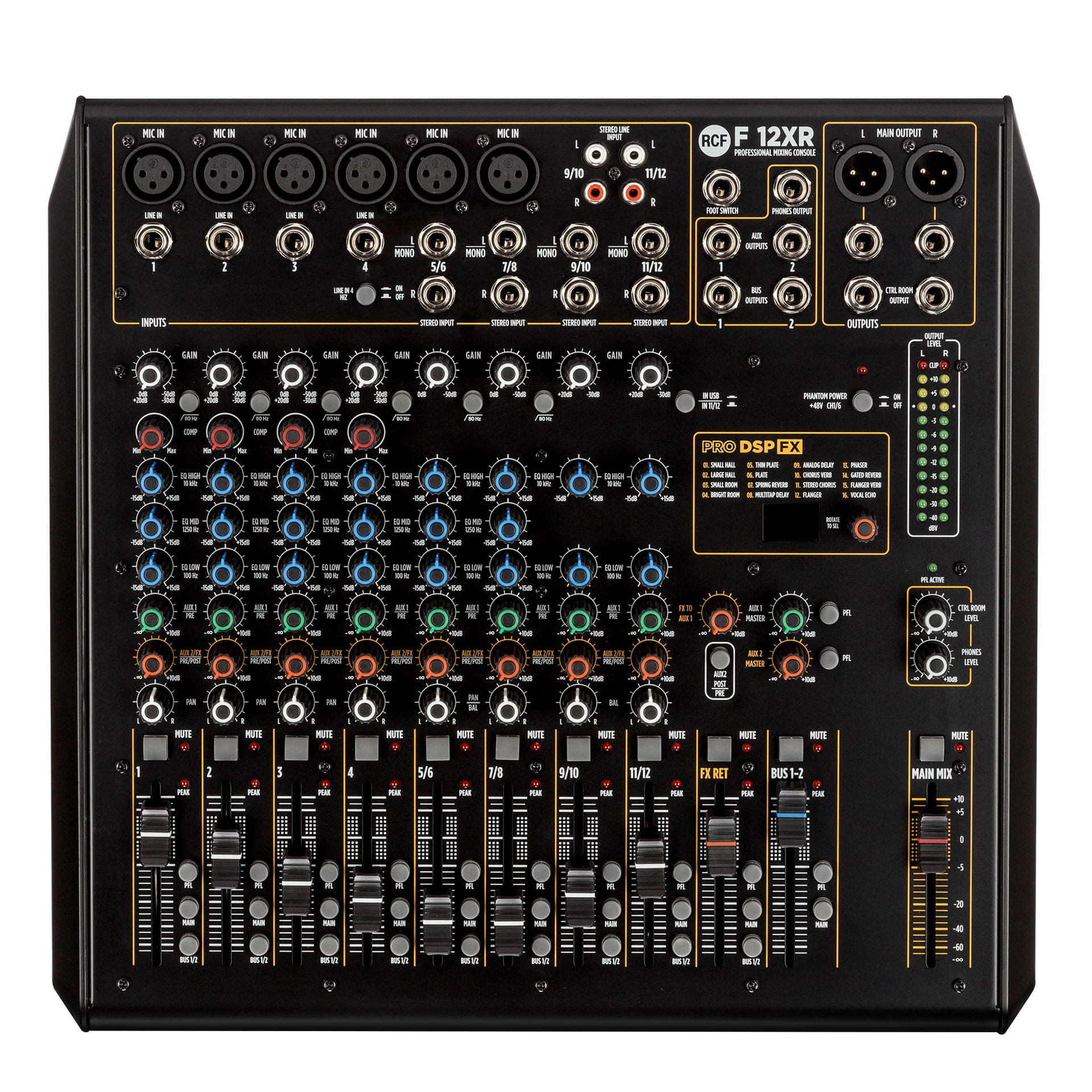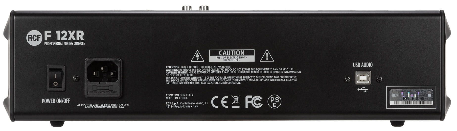 RCF F12XR - To mikser bazujący na bogatym analogowym brzmieniu profesjonalnej serii mikserów RCF E z estetycznym intuicyjnym panelem, wysokiej jakości komponentami, które pomogą zmiksować muzykę z najlepszym wynikiem jakości przy minimalnym doświadczeniu technicznym realizatora. Umieszczony w solidnej metalowej obudowie opiera się na w pełni symetrycznej i niskoszumowej ścieżce audio od wejścia do wyjścia z pojedynczymi kompresorami sterującymi w celu ograniczenia szczytowych wartości sygnału. Posiada trzy pasmowy EQ na wejściach mikrofonowych oraz 2 pasmowy na kanałach stereo. Wysokiej jakości efekty FX, wyjście AUX oraz złącze USB do rejestrowania miksu oraz odtwarzania plików audio.