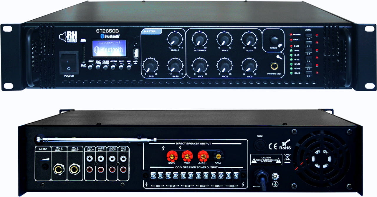 Wzmacniacz radiowęzłowy. uniwersalny, znajdujący swoje zastosowanie jako zasilanie systemów nagłośnienia we wszystkich obiektach użyteczności publicznej, hotelach, restauracjach, urzędach, handlowych oraz sakralnych. Nowoczesna jednostka nagłośnieniowa z odtwarzaczem MP3 oraz tunerem FM. Duża moc wyjściowa oraz wyjście z podziałem na 6 niezależnych stref głośników pozwala na zasilanie systemów nagłaśniających duże powierzchnie (wszystkie strefy mają wsólną regulację głośności). Wejścia: 3 x MIC (MIC z funkcją priorytetu), 3 x AUX, wbudowany odtwarzacz MP3 - dane z zewnętrznej pamięci USB lub karty SD oraz łącze Bluetooth. Wskaźnik poziomu sygnału wyjściowego MASTER VOLUME LED, wspólna korekcja tonów niskich i wysokich. Całość z możliwością zdalnego sterowania.