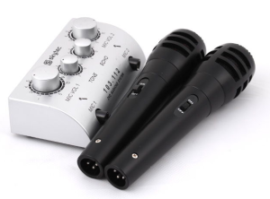 Zestaw do KARAOKE z mikserem i dwoma mikrofonami zapewnia doskonałą zabawę przy użyciu wraz z zestawem kina domowego lub komputerem. Mikser pozwala na podkładanie pod muzykę głosów dwóch osób, za pośrednictwem dwóch mikrofonów wokalnych. W zestawie znajdują się dwa mikrofony, niewielki mikser, dający możliwość ustawienia profesjonalnego wokalowego pogłosu i regulujący głośność mikrofonów, a także kabel połączeniowy 3xRCA-3xRCA (chinch).