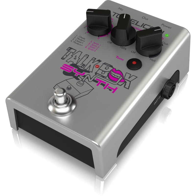 Talkbox Synth od TC-Helicon to zamknięty w metalowej obudowie procesor efektów wokalnych sterowanych sygnałem gitary prowadzącej, udostępniający po cztery style efektów typu talk box oraz brzmień synth. Grupa efektów talk box to nic innego jak symulacja słynnych efektów wyposażonych w długą rurkę, której koniec gitarzysta umieszczał w ustach i ich ruchem modulował dźwięk – dzięki TC-Helicon ten mało higieniczny performance powoli odchodzi do lamusa. Talkbox oferuje tryb Classic, mocno nasycony, przypominający brzmienie efektów z lat ’70, czystszy tryb Modern, przypominający efekty typu vocoder, oraz ich wersje Classic+ i Modern+, gdzie zostaje dodany sygnał z gitary prowadzącej dla efektu śpiewu unisono z gitarą. Tryby Synth to barwy typu robot-talk, różniące się kształtem fali, niemniej wszystkie są sterowane dźwiękami gitary prowadzącej.