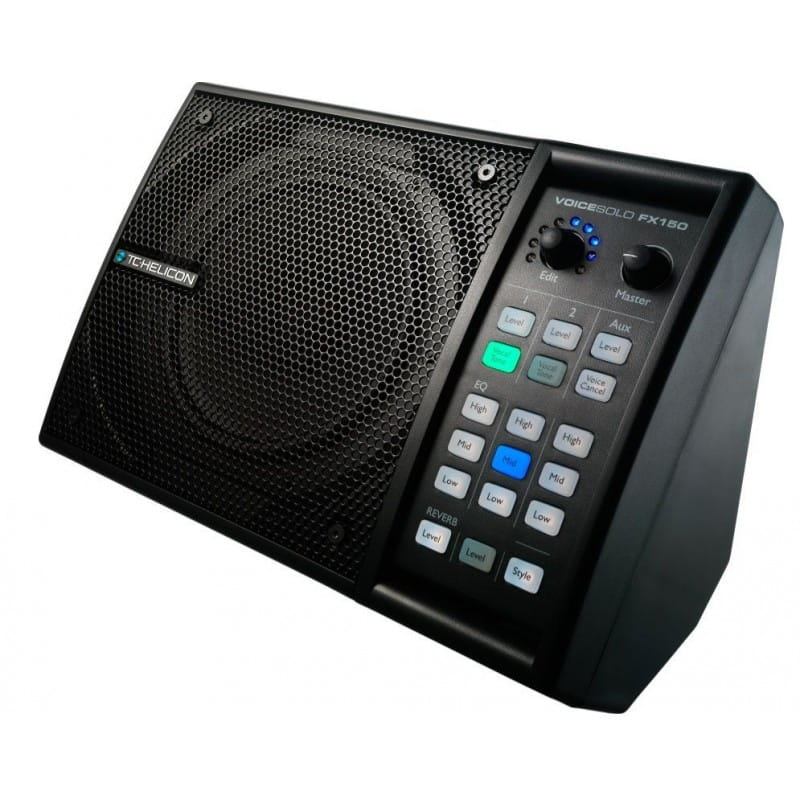 Na pokładzie VoiceSolo FX150 zainstalowano 3-kanałowy cyfrowy mikser, wyposażony w procesor efektów, takich jak reverb z 9 studyjnej klasy stylami, inteligentna korekcja oraz kompresor. Obsługę efektów można realizować dzięki opcjonalnemu mikrofonowi TC Helicon MP-75 lub MP-76, które są wyposażone w przyciski sterujące funkcjami innych urządzeń marki TC Helicon. Na każdym kanale znajduje się niezależna, trójzakresowa korekcja barwy, natomiast dwa tory wyposażono w funkcję Vocal Tone – Twojego osobistego realizatora dźwięku, automatycznie dbającego o odpowiednie nastawy EQ, kompresora, de-essera pasujące do Twojego głosu lub instrumenu. Tak, VoiceSolo FX150 może pracować także jako combo instrumentalne, bez problemu współpracujące z gitarą elektryczną czy basową, a po podłączeniu zewnętrznego źródła dźwięku do złącza AUX i użyciu funkcji Voice Cancel, może służyć jako narzędzie do ćwiczeń głosu.