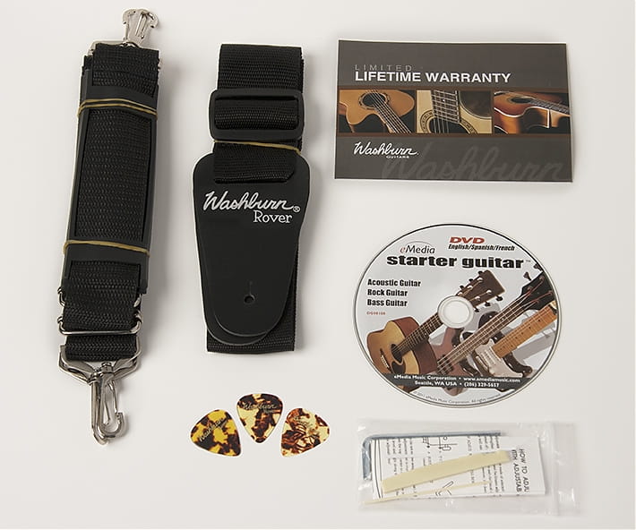 W zestawie: twardy futerał (rączka, szelki), pasek, kostki do gry, płyta instruktarzowa CD.